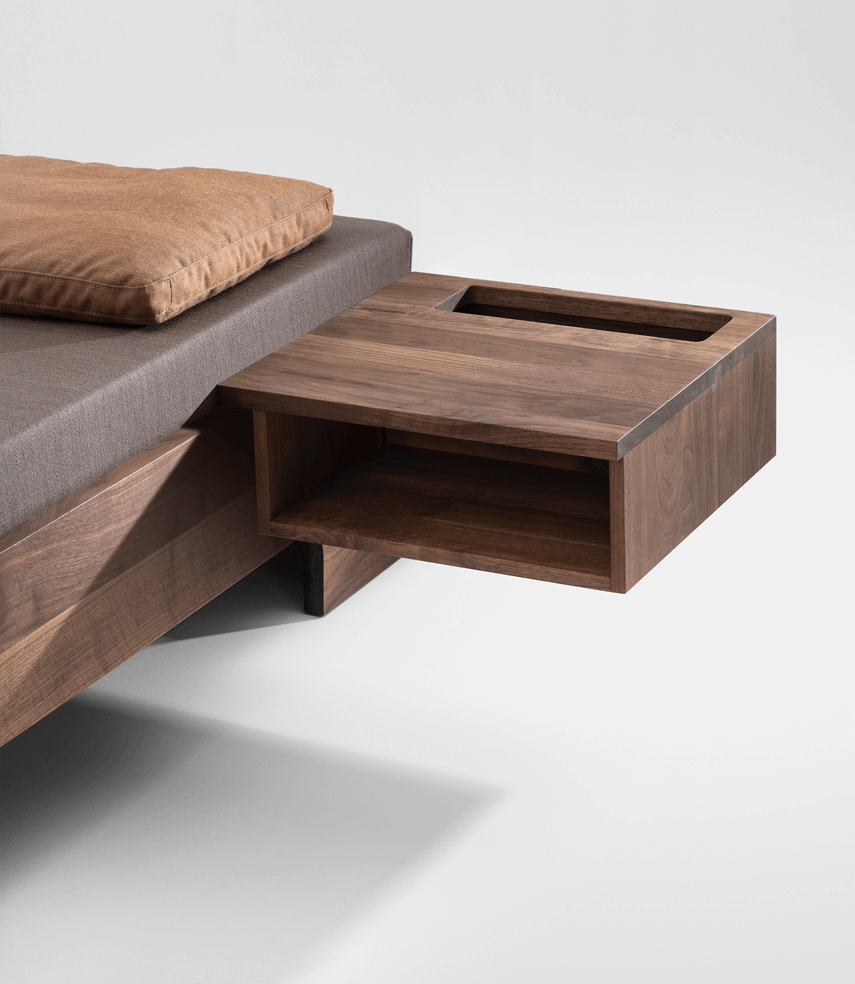 The DEPO bedside table can be hung on the bed side of various ZEITRAUM beds. The position is freely selectable, it is fixed to the bed frame to secure it. There is a cable outlet in the bottom of the storage compartment.