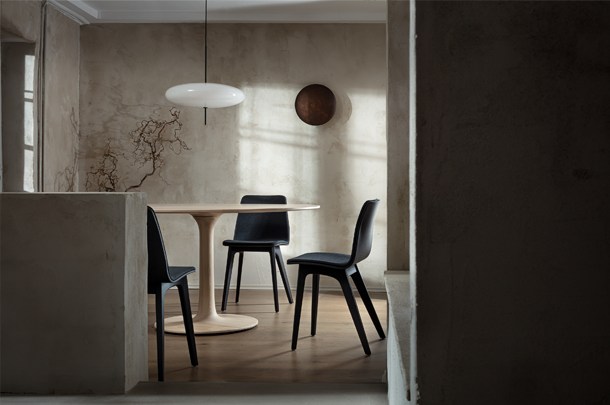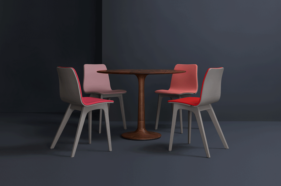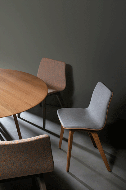 The positioning of the legs gives the chair MORPH a unique posture, as if it had a support and a free leg. The sculpturally formed sub-frame conveys the interplay between stability and dynamism. Due to its delicate appearance this straightforward chair exudes an air of lightness that requires only a small area. The solid wood frame carries a light molded veneered wood shell, optionally with padded seat, or a fully upholstered shell.