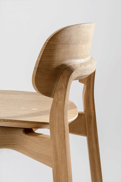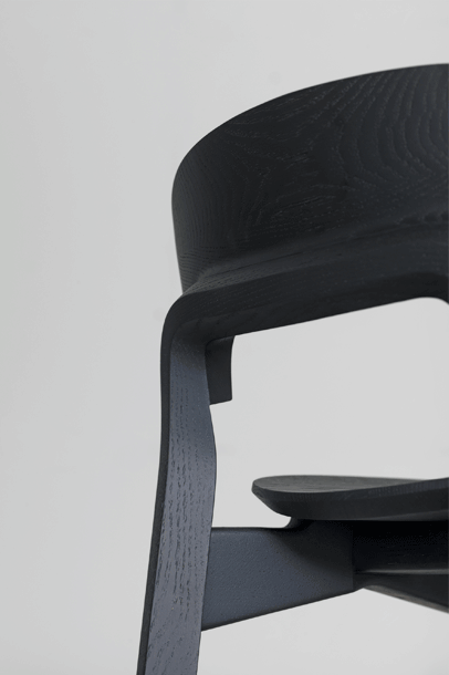 NONOTO BAR – the modulated bar chair. The NONOTO chair family is complemented with a new barstool: NONOTO BAR. The unique junction between frame and backrest lends the stool a sculptural character. A ring serves as footrest while also providing additional stability and adding another finish: both the walnut and the graphite black stain design come with a matt black powder coated footrest. Natural oak version and all other stains feature a rosegold coated footrest.