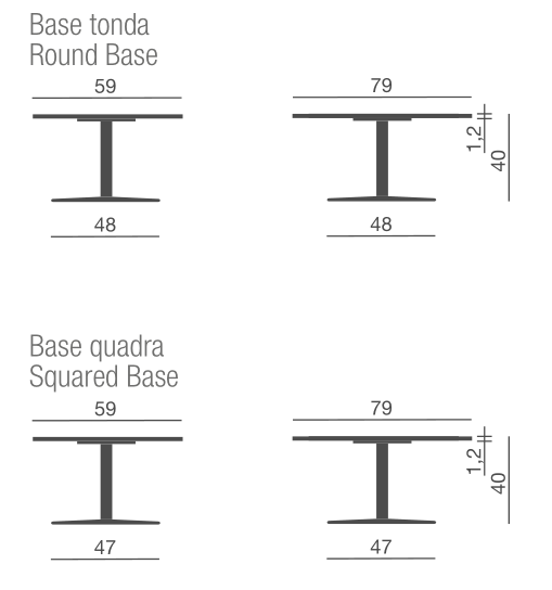 - HPL (High Pressure Laminate) round or square tops with thickness 12 mm in white or black colour