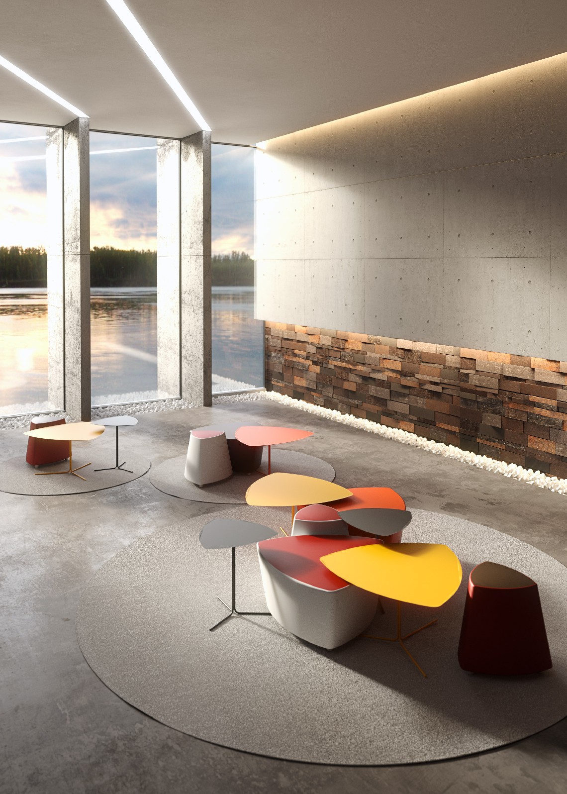 - Round flat steel base white - yellow - orange - dove-colour - lava painted or chromed.