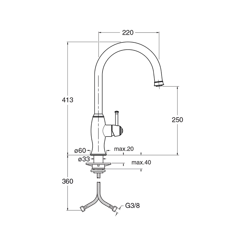 Miscelatore monocomando cucina, bocca orientabile, monoforo da piano, con miscelazione meccanica a doppio scatto laterale destra, H. 413 mm