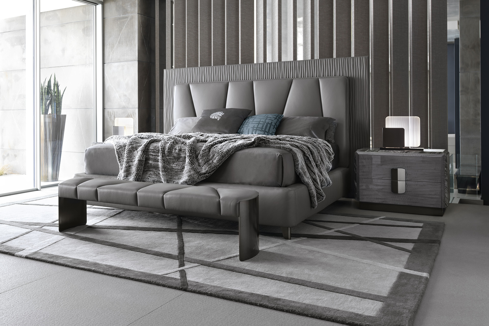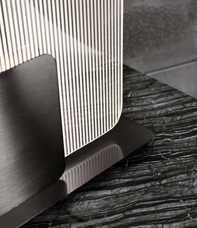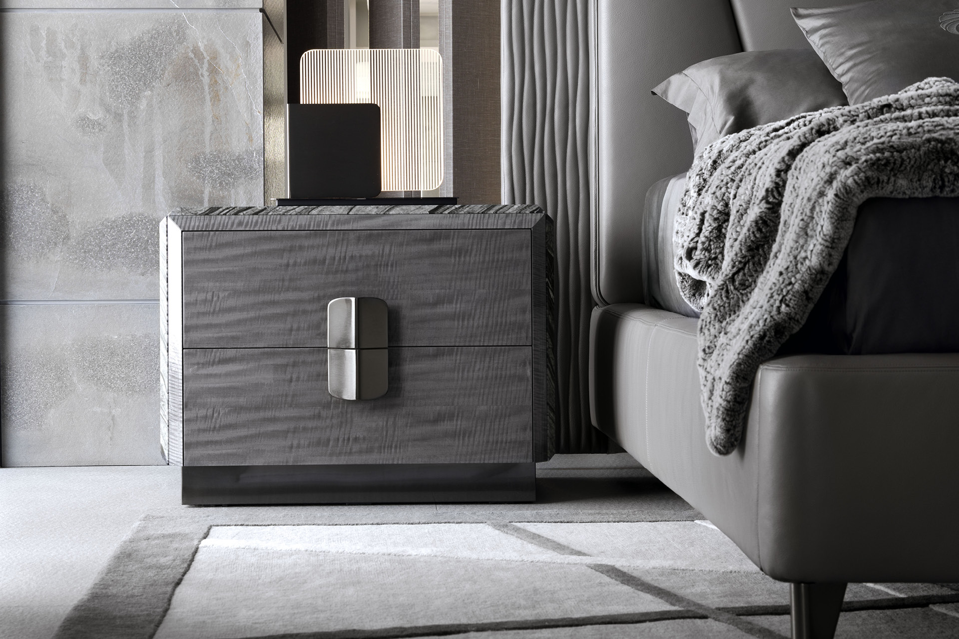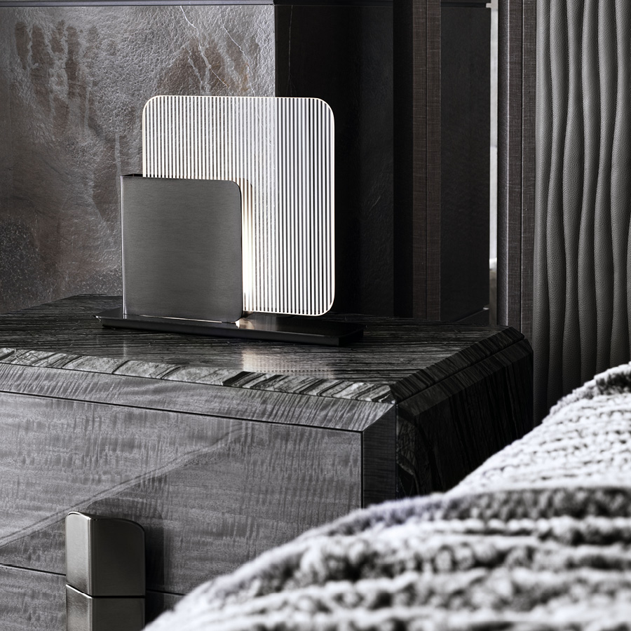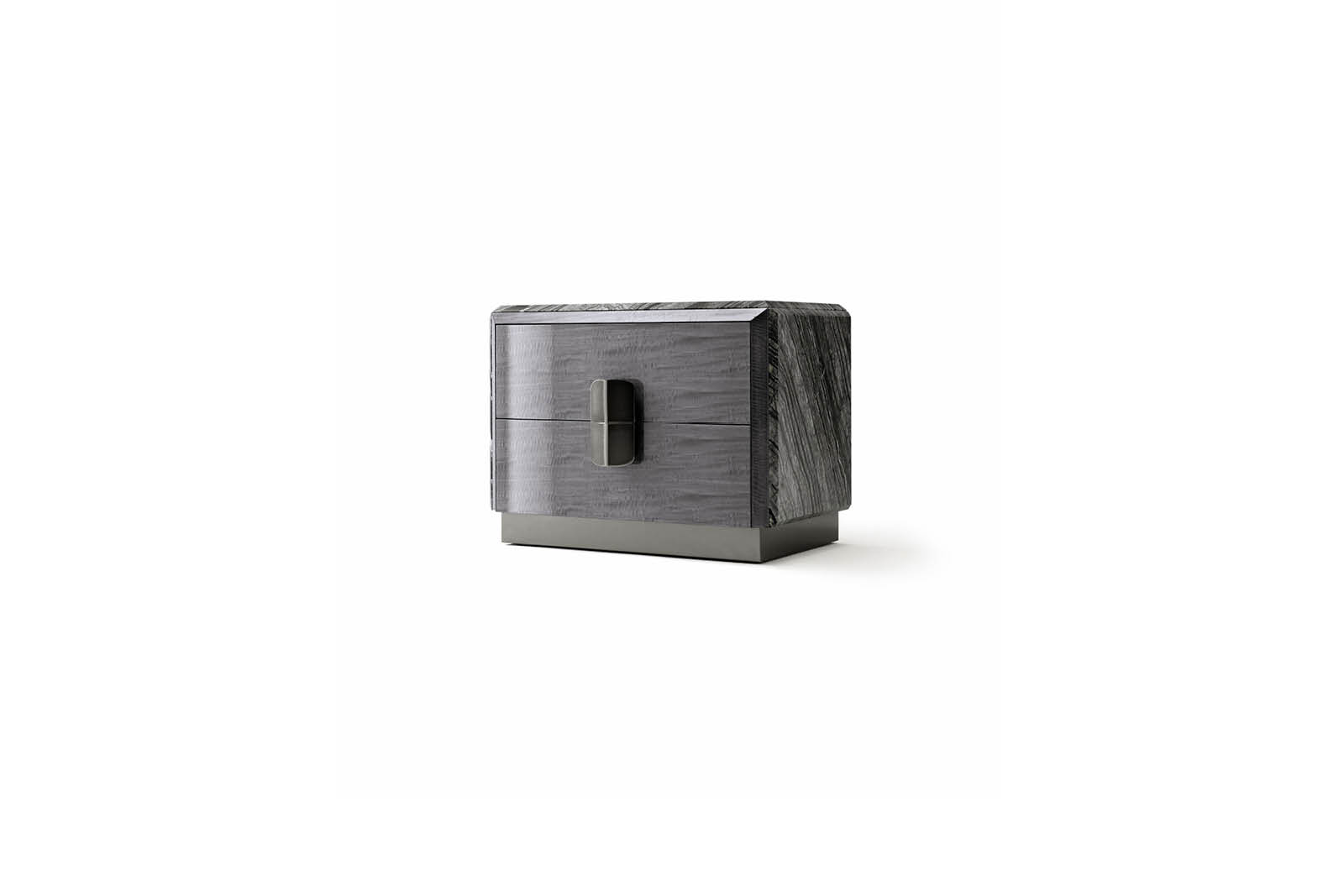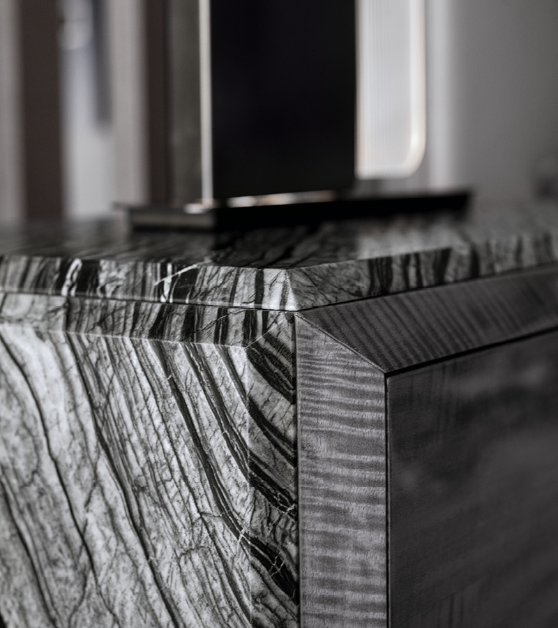 Night table in Madagascar figured Mowinghi veneer in high gloss polyester finish. Top and sides in Kenya Black marble. Base and handles in satin black nickel stainless steel. 2 full extension drawers with bottom part in velvet fabric.