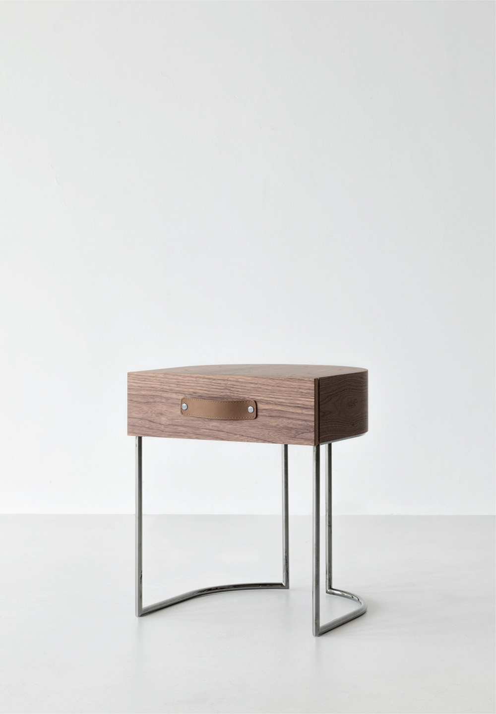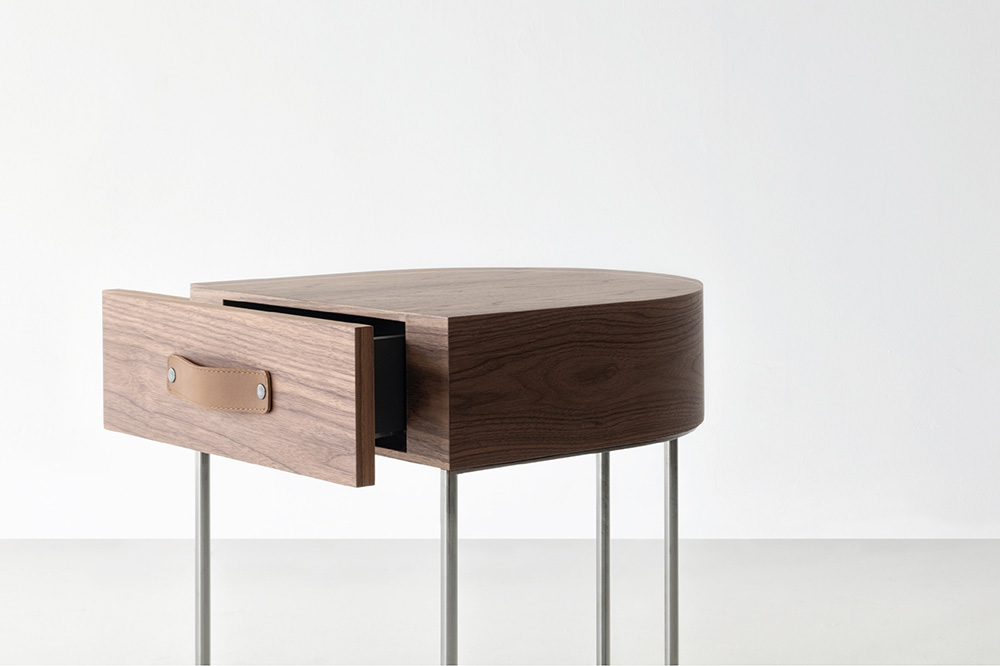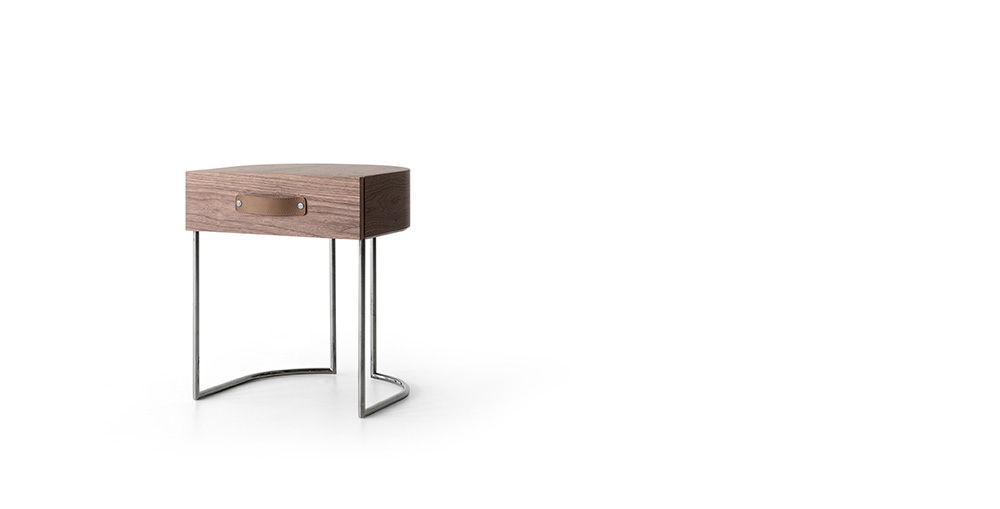 Dino drawer with soft-closing mechanism available in Canaletto walnut wood. Leather handle in Setanil 76. Metal base available in bright chromed or black chromed finish. Dino cassetto con soft closing disponibile in finitura noce Canaletto. Maniglia in pelle Setanil 76. Base in metallo disponibile cromata lucida o cromata nera.