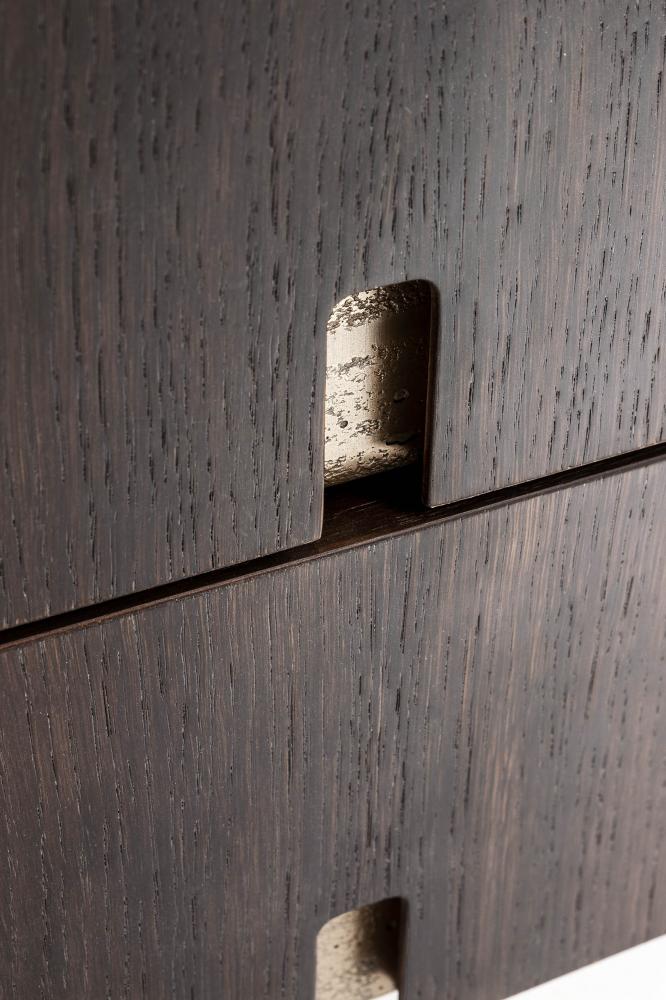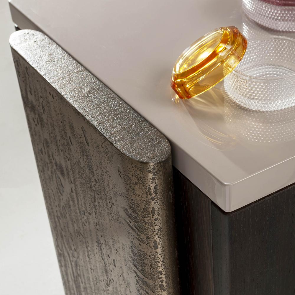 Top and chest of drawers in plain, dyed or lacquered wood in all RAL colours. Sides and handles available in brushed "gold" or in liquid metal Raptor.