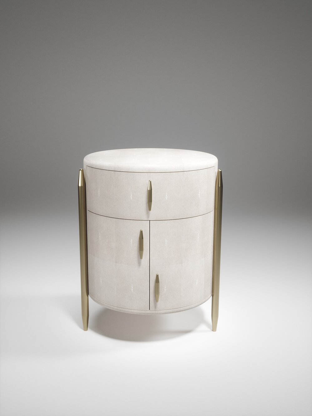 The Dandy Round Bedside Table by Kifu Paris is an elegant and a luxurious home accent, inlaid in cream shagreen with bronze-patina brass details. This piece includes 1 drawer total and a cabinet below; the interiors are inlaid in gemelina wood veneer. Available in other finishes and as a square version. This piece is designed by Kifu Augousti, the daughter of Ria and Yiouri Augousti.、