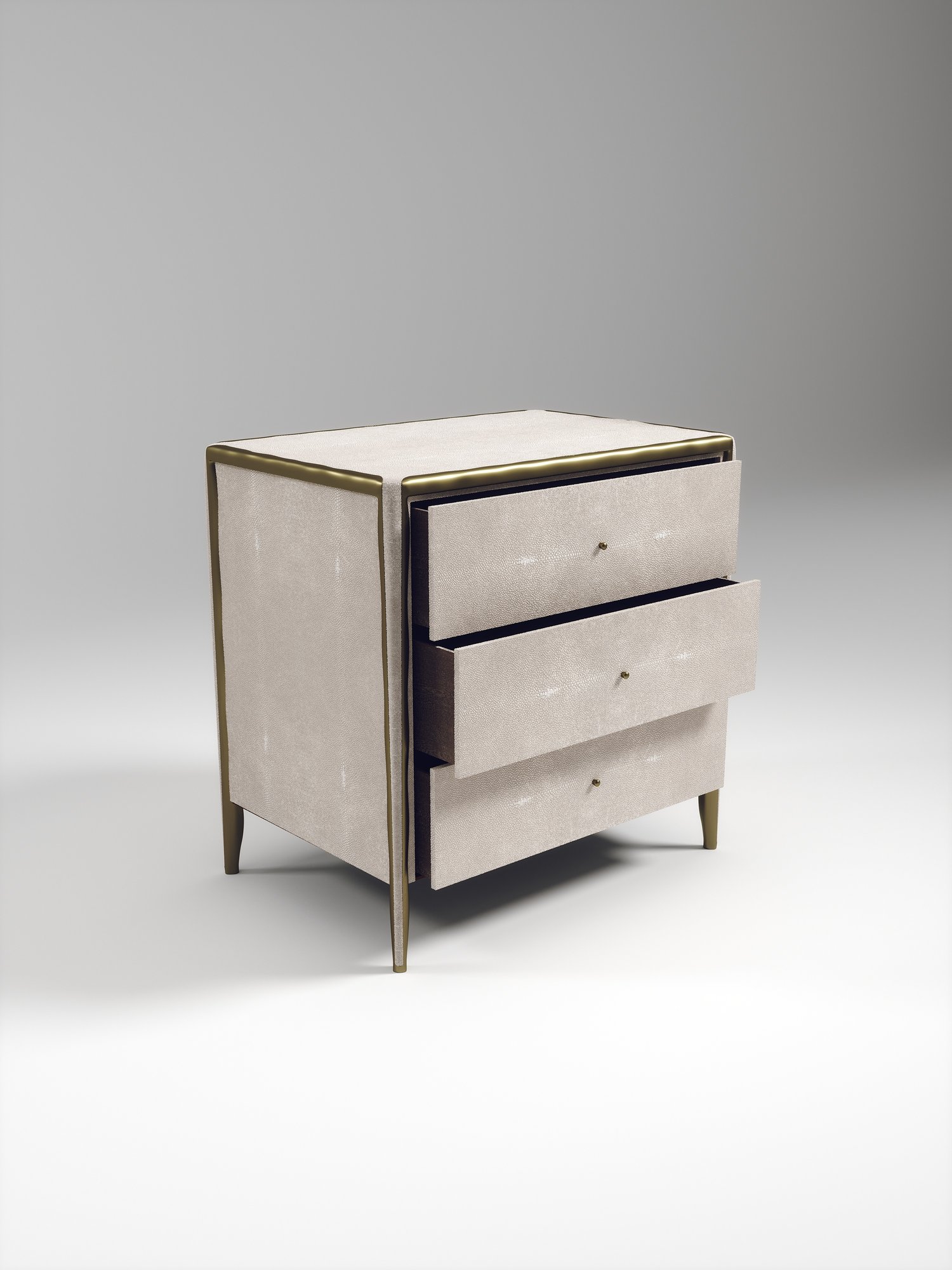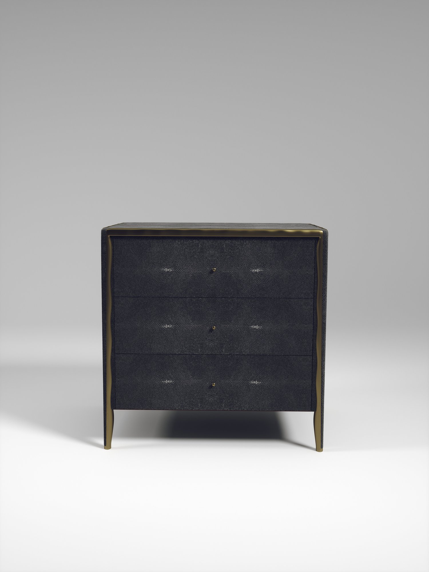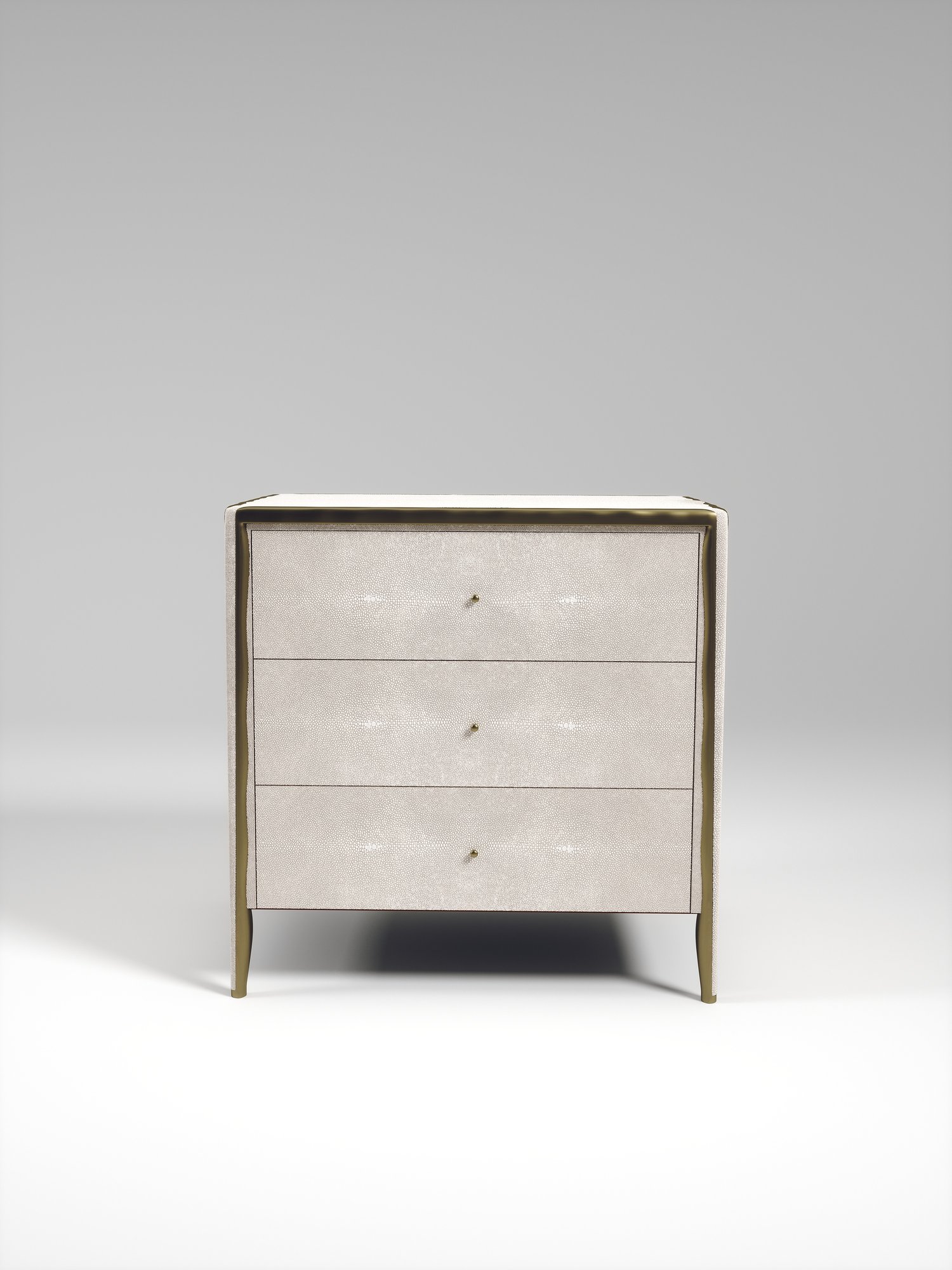 The Melting Rectangle Bedside Table by R&Y Augousti is an elegant piece for any space. The cream shagreen inlaid piece is classic, but accentuated by their signature organic melting bronze-patina brass frame. This side table includes 3 drawers. This piece is part of the Melting Capsule. Available in other finishes.