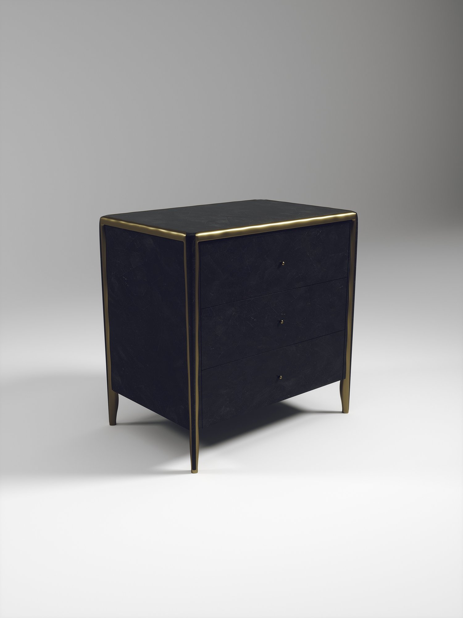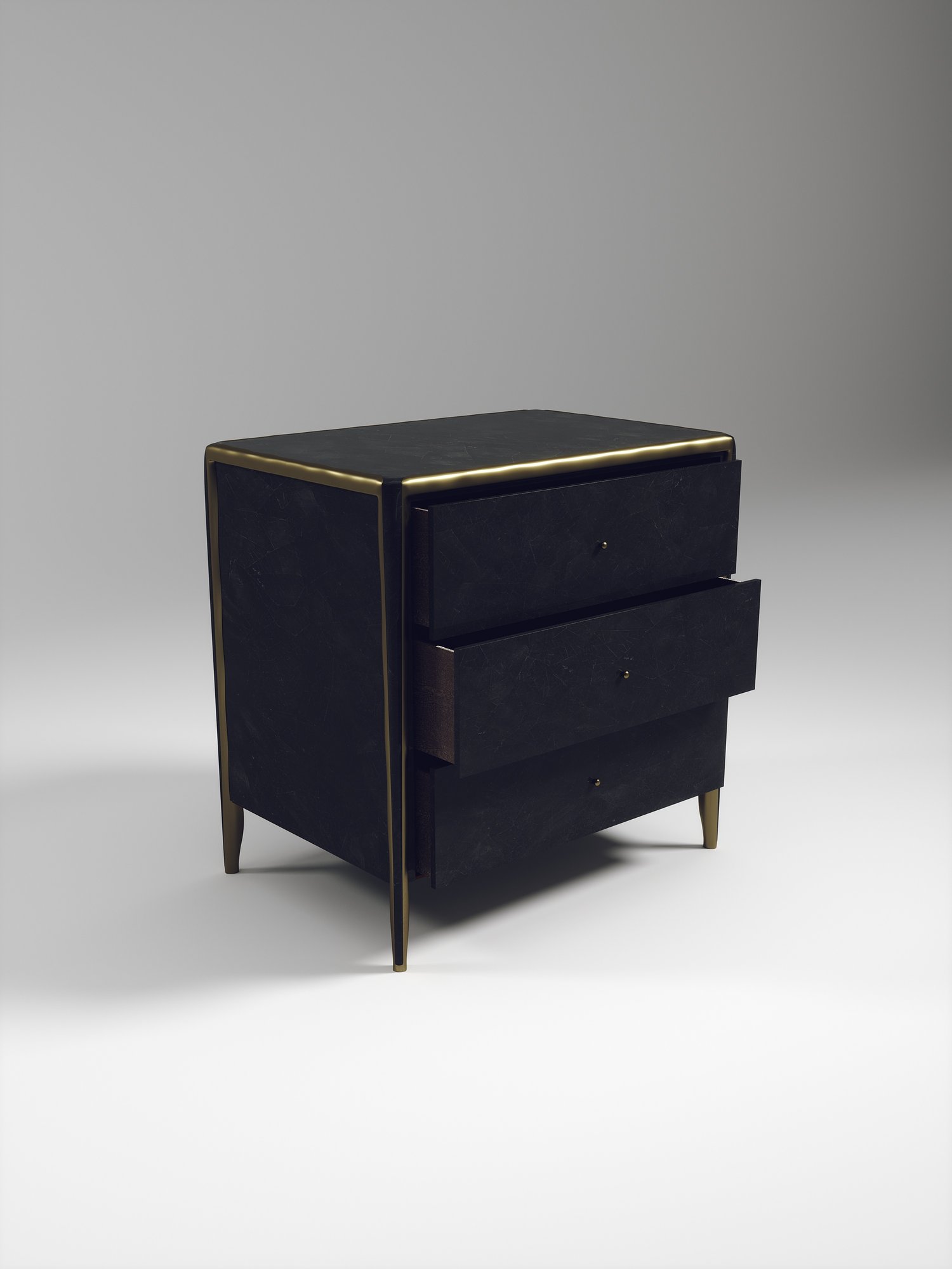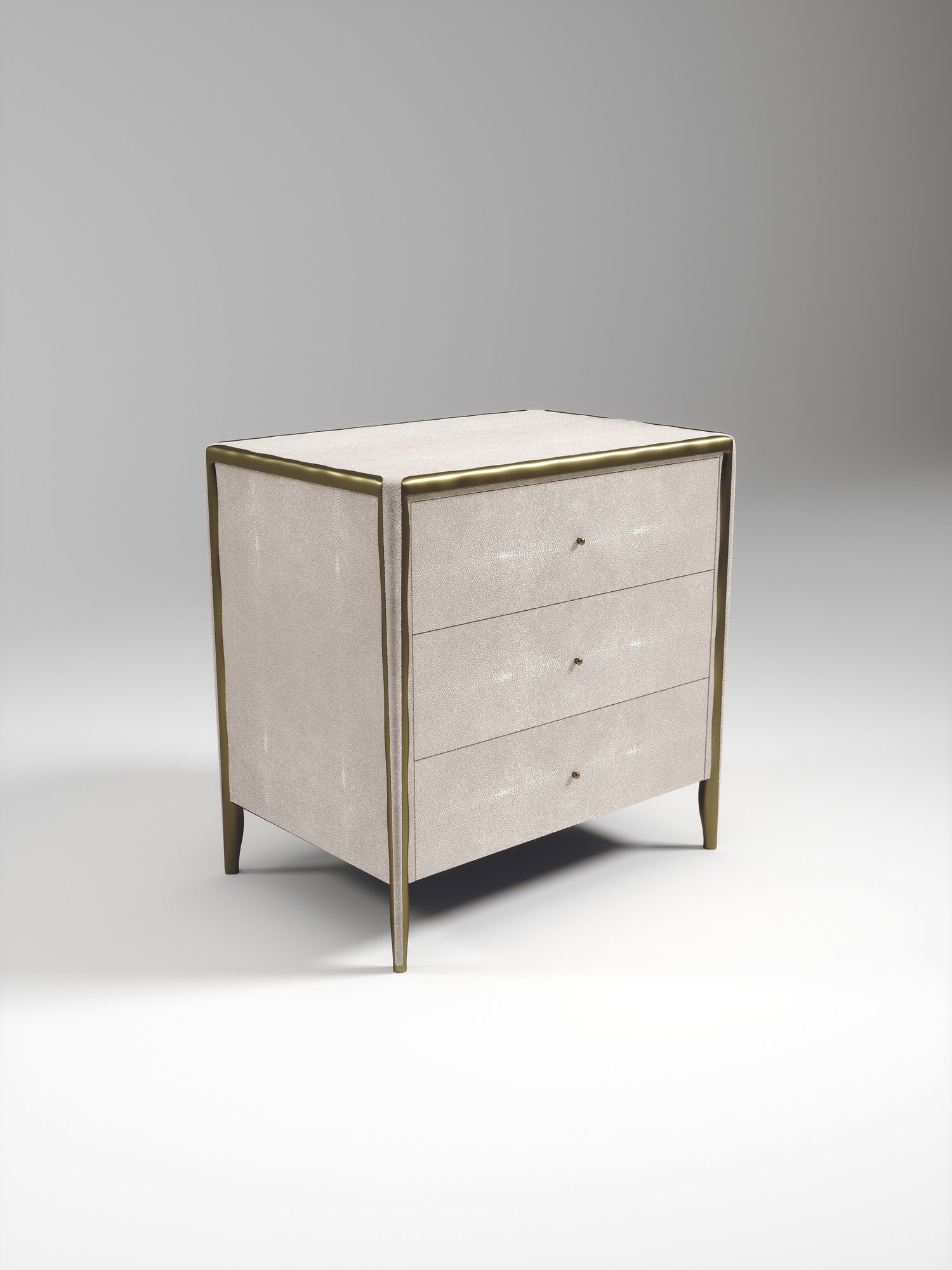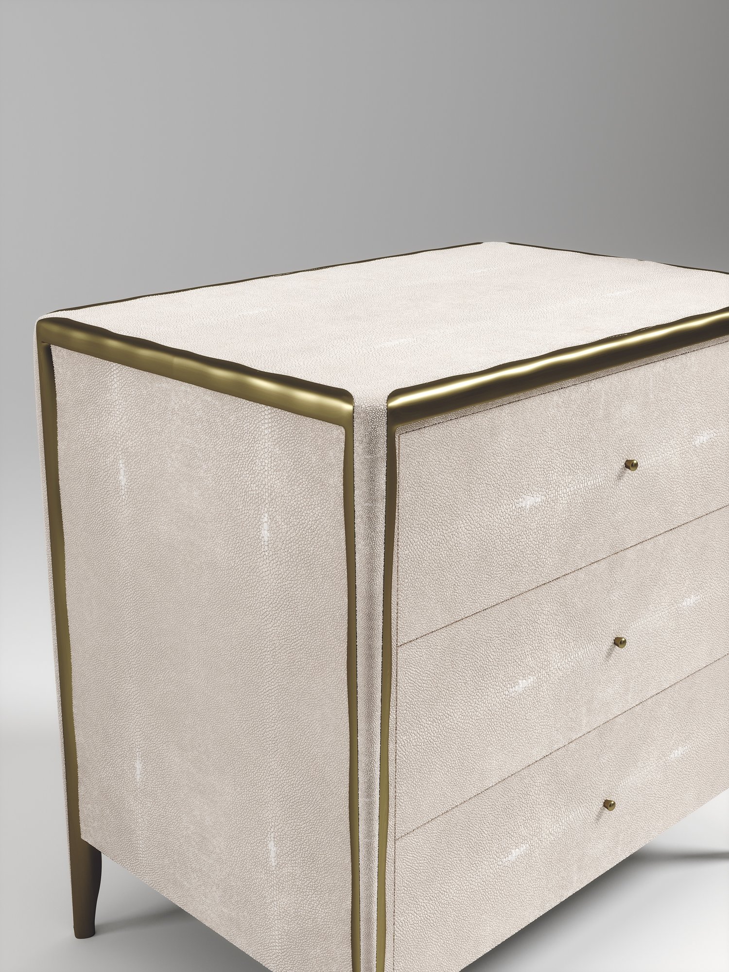 The Melting Rectangle Bedside Table by R&Y Augousti is an elegant piece for any space. The cream shagreen inlaid piece is classic, but accentuated by their signature organic melting bronze-patina brass frame. This side table includes 3 drawers. This piece is part of the Melting Capsule. Available in other finishes.