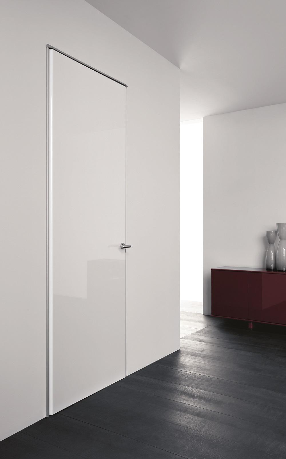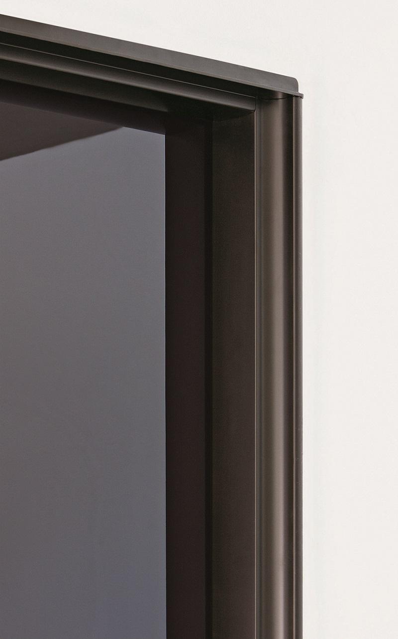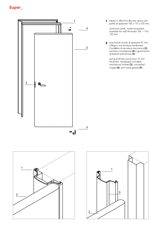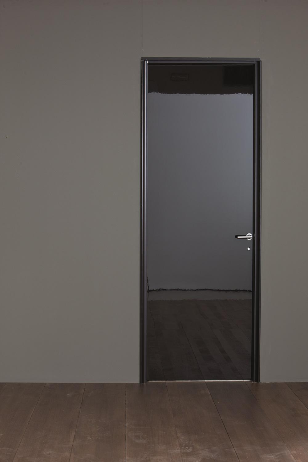 Swing bullnose wood door 41 mm thick. Border with rounded edges. Mechanical lockset, concealed hinges and anti-noise gasket. Jamb in matte lacquered aluminum available for wall thickness 100 – 110 – 125 mm. Reversible opening direction. Mounted on subframe with painted sheet metal.
