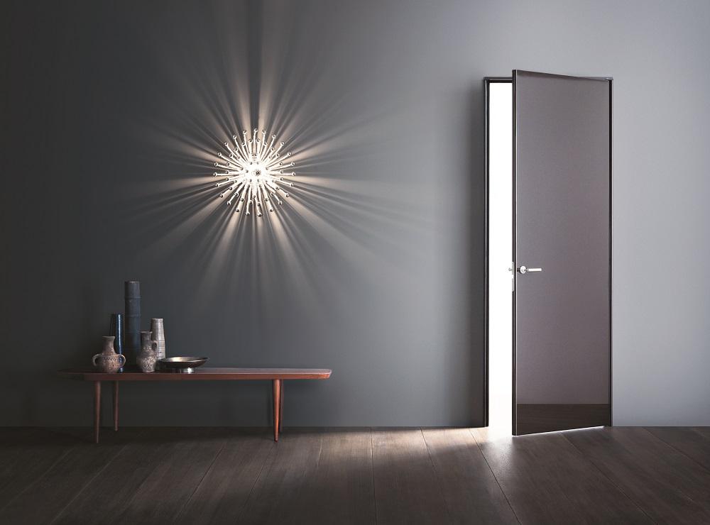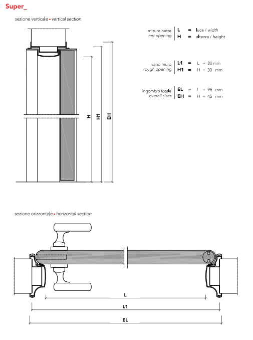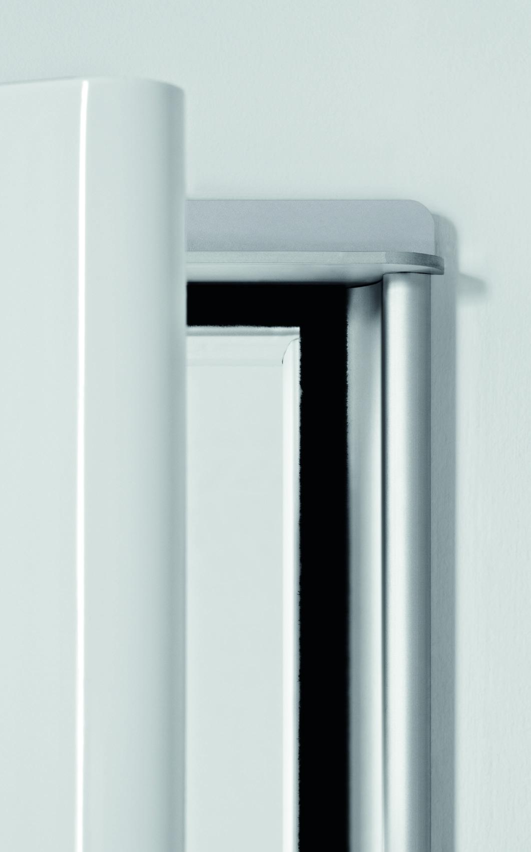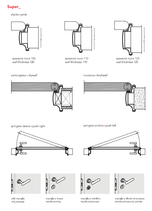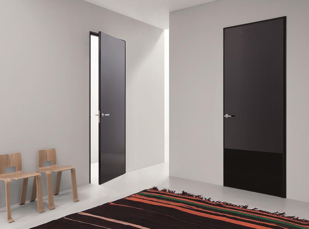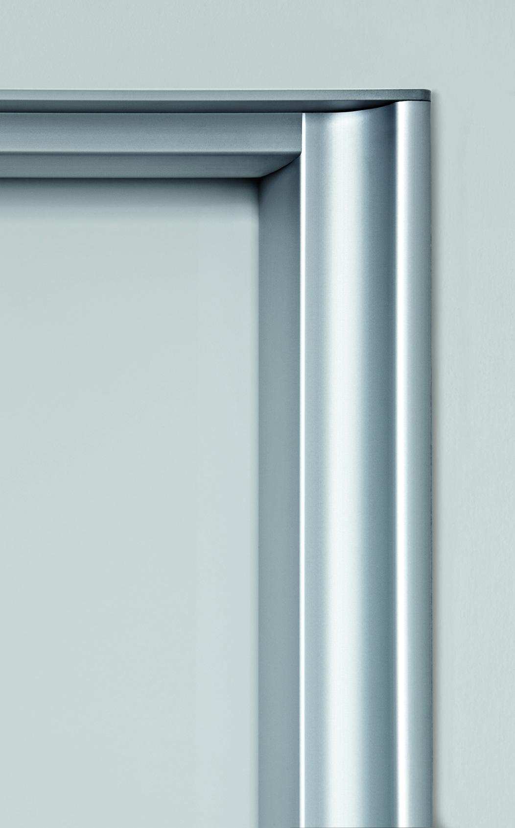 Swing bullnose wood door 41 mm thick. Border with rounded edges. Mechanical lockset, concealed hinges and anti-noise gasket. Jamb in matte lacquered aluminum available for wall thickness 100 – 110 – 125 mm. Reversible opening direction. Mounted on subframe with painted sheet metal.