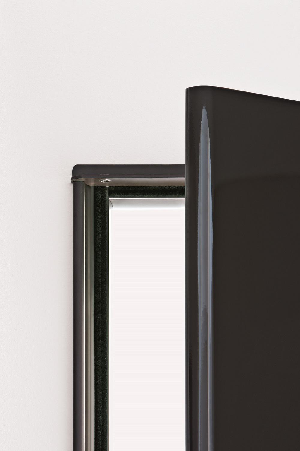 One of the classic models designed by Luigi Caccia Dominioni. The door, with its rounded edges, is surrounded by the aluminium frame which exalts the ample and clean surface.