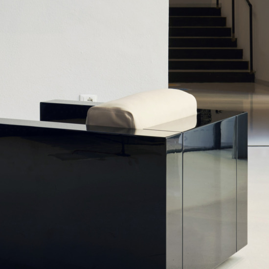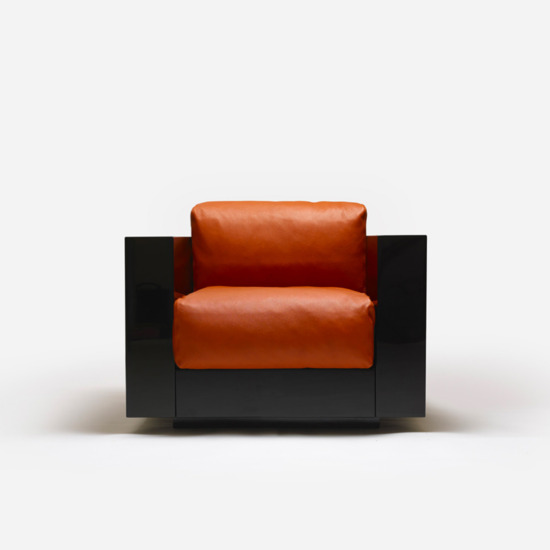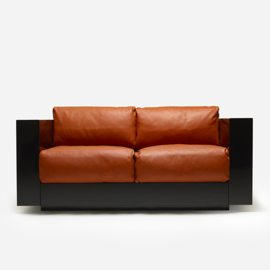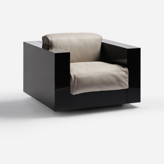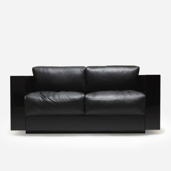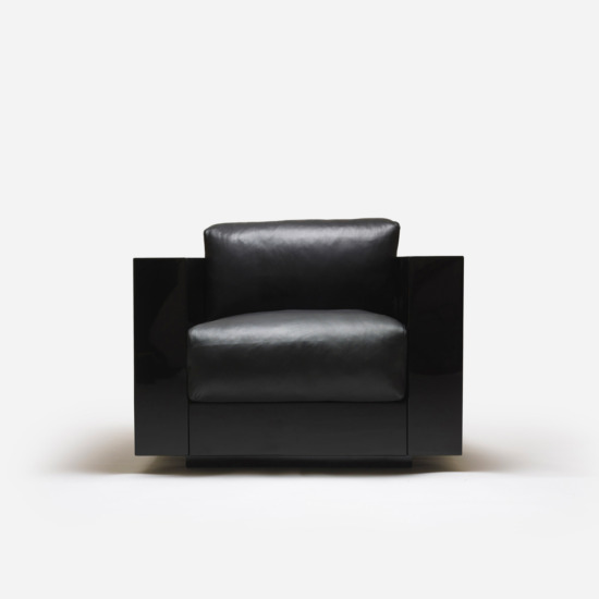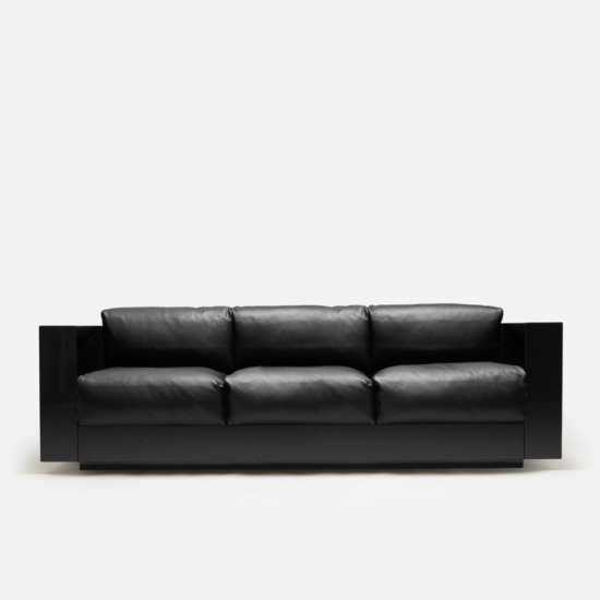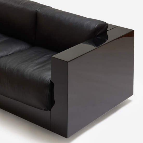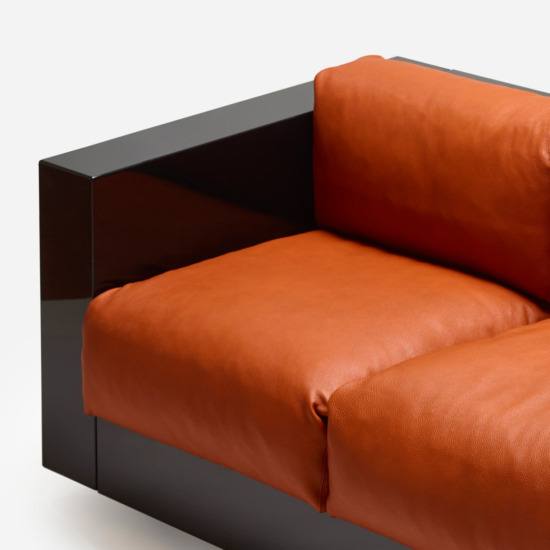 The series is composed of an armchair and sofas with two, three or four seats. The rigid structure, made by assembling four parts of equal thickness, with rounded edges, contains slightly protruding seat cushions. The desired purity of the silhouette is accentuated by the precious finishes: glossy polyester lacquer for the chassis, similar to that of a pianoforte, and the fine leather of the soft cushions, resembling the upholstery in luxury automobiles. The essential form combined with the precision of the design and the refinement of the finishes and details make this project by Lella and Massimo Vignelli timeless, over and above passing fashions, which they always avoided.