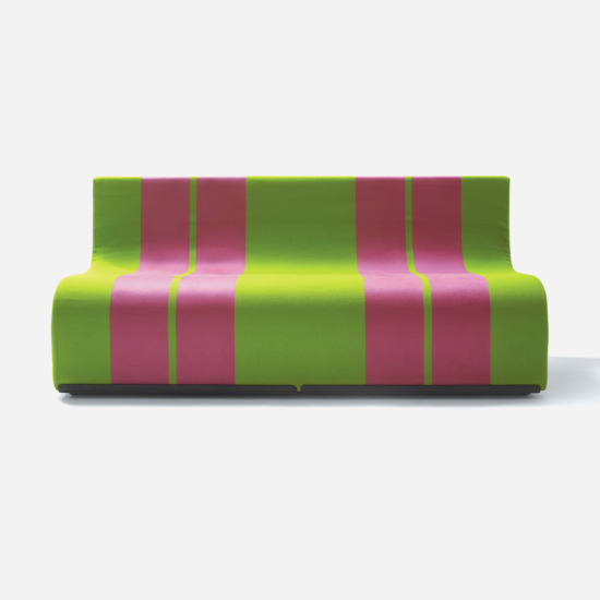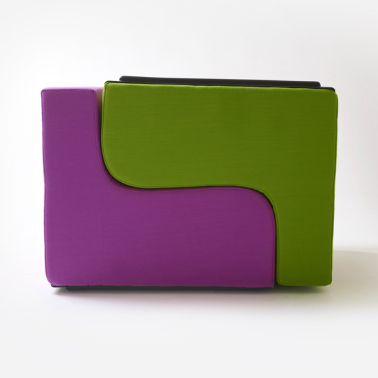 Sofo is a seat to place in a row, like a train, or to stack to build solid, colorful mountains. It is simply a block made with an S—shaped cut from a cube of polyurethane, covered with fabric featuring two large stripes. The result of a very simple operation, without wasted material or thought. It presents itself as a compact, abstract, colorful object that communicates the joy of living, like things that arrive from another world.