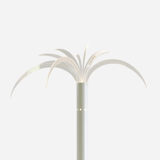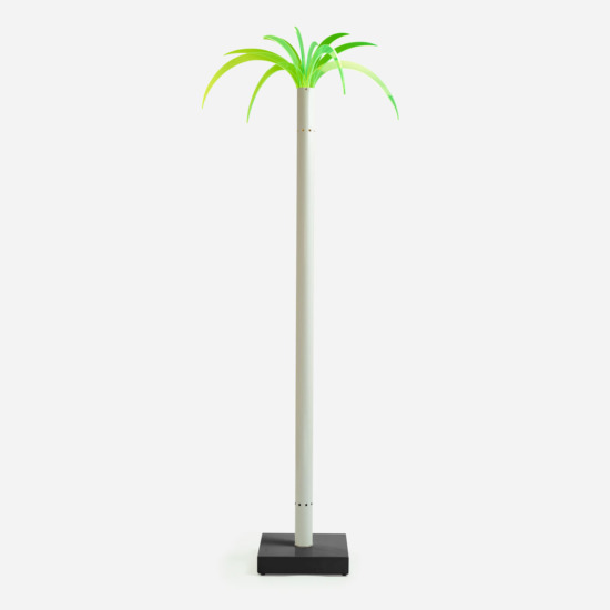 The prototype of the Sanremo floor lamp was an engagement present from Dario Bartolini to Lucia Morozzi, given to her in the villa in Roccamare designed by Ernesto Nathan Rogers. Sanremo is composed of a slender metal trunk topped by “foliage” like that of a stylized palm tree, formed by lanceolate transparent or fluorescent green methacrylate leaves that radiate light. The prototype also called for a sound similar to the song of a cricket, eliminated in the production version.