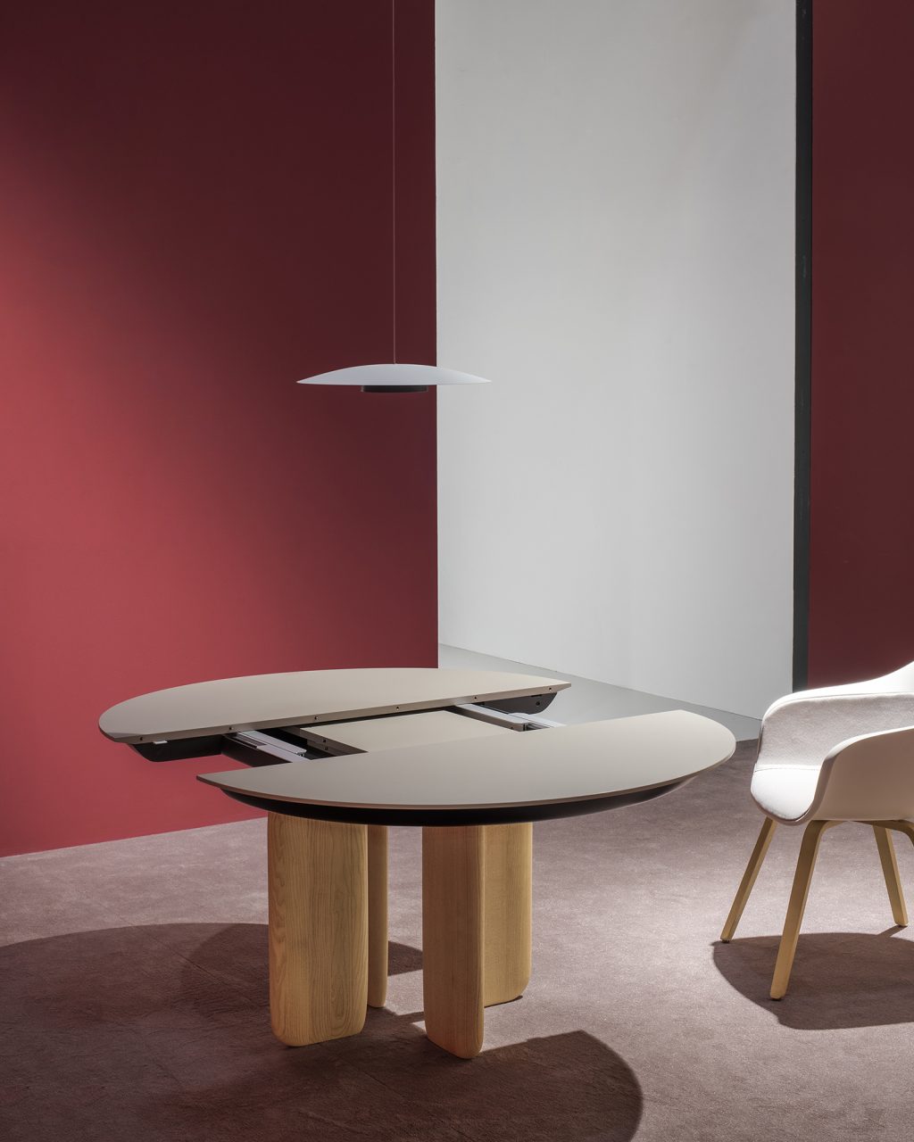 Pala is a system of round and oval tables whose leg recalls the blade of the rudder. Available in the fixed version, it stands out for its fluid and innovative extendable version, a distinctive feature of Kristalia table collections. Available in different materials for tops and base structure.