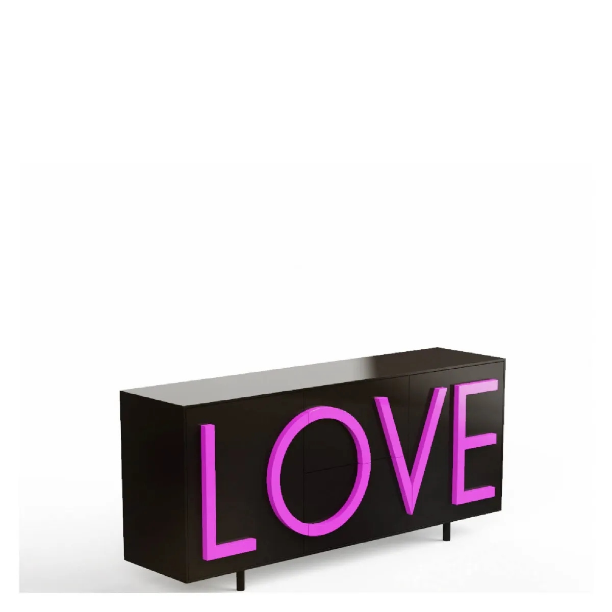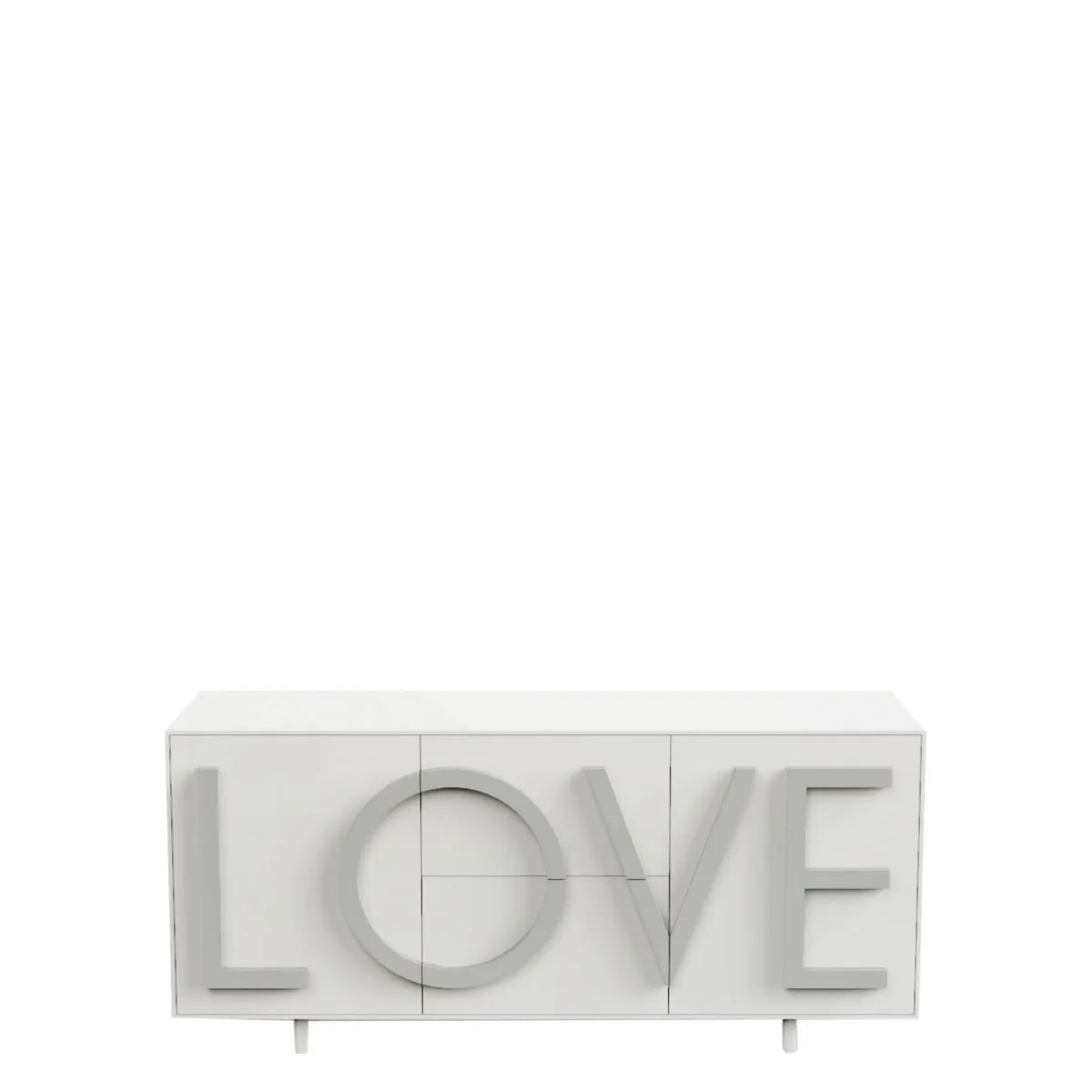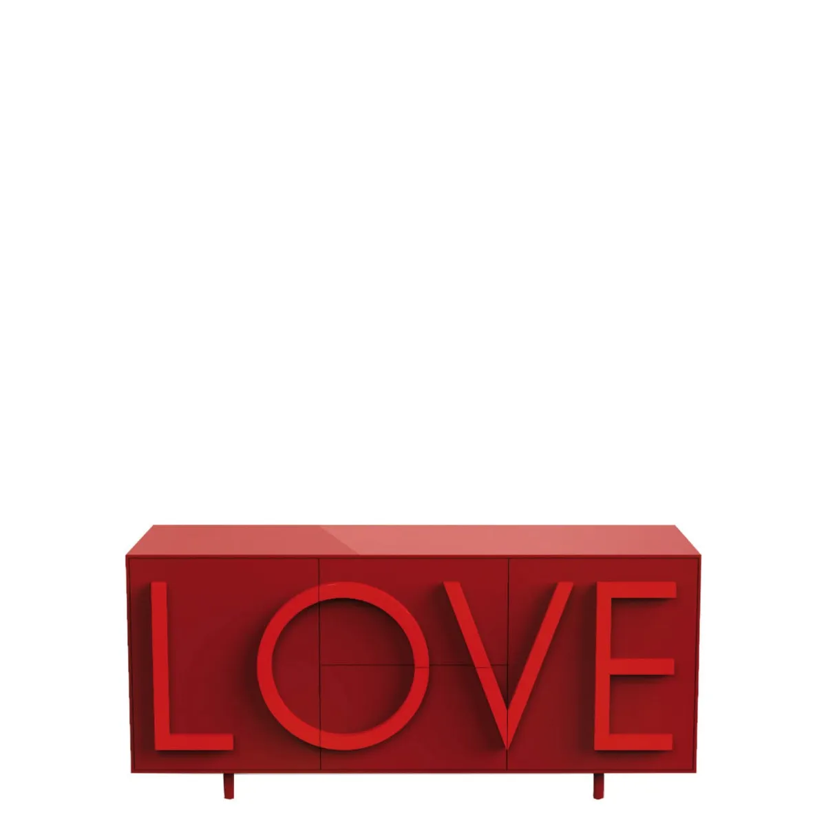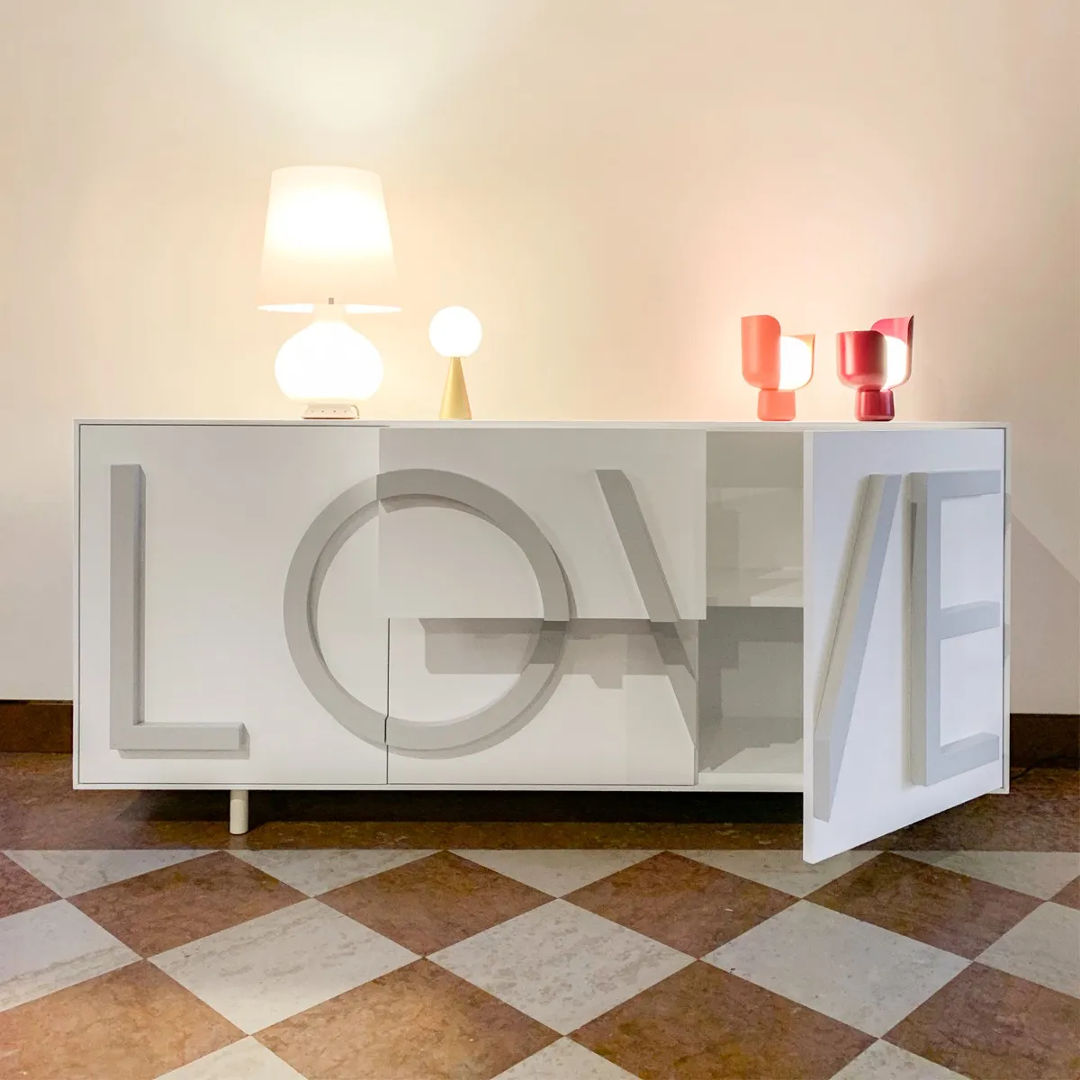 Con la sua forma caratterizzante e tutta da scoprire, la madia LOVE (cabinet) costituisce un manifesto espressivo, un poster bidimensionale che parla d’amore. Dal connubio tra estetica e funzione, le linee diventano tridimensionali, il foglio si estrude diventando contenitore e le lettere escono dal foglio generando delle maniglie, elementi versatili e disponibili in vari colori. ?Amore è scegliersi a scatola chiusa, avvolti da un alone di mistero. Amore è un fedele custode di sogni condivisi, un contenitore di possibilità? Fabio Novembre