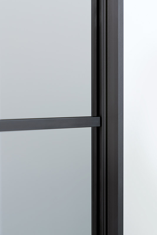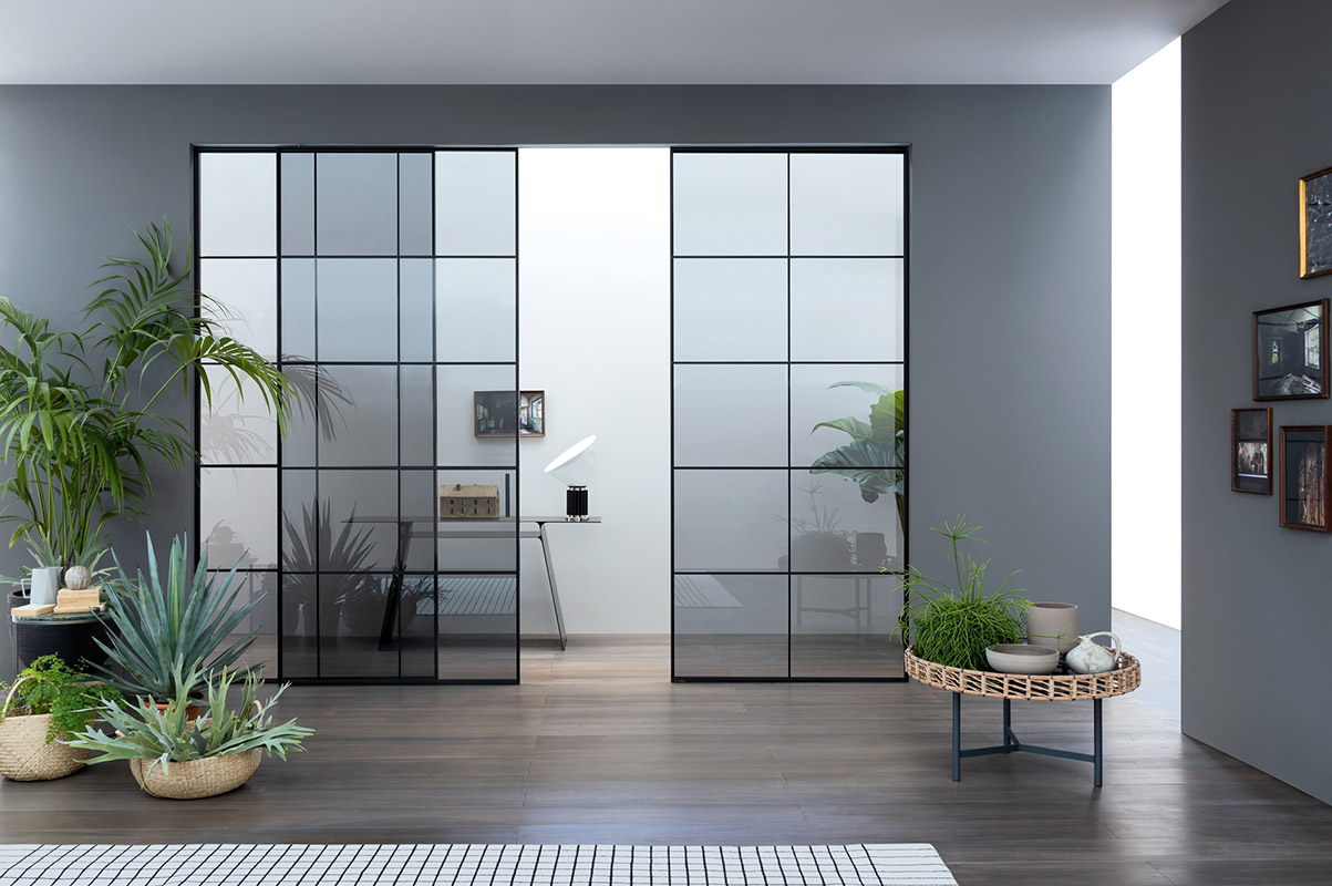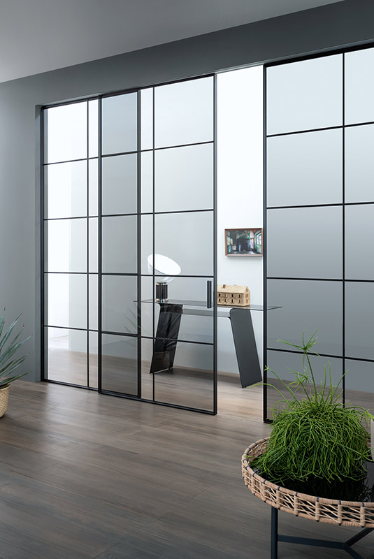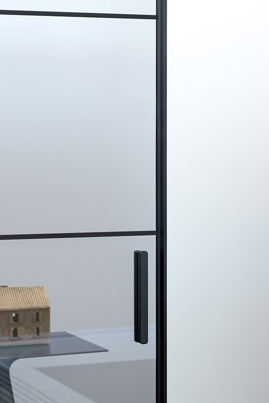 La porta per interni esterno muro Drive è un sistema combinato di porta scorrevole e di binario telescopico predisposto per essere installato direttamente a parete. Può leggersi come una superficie appoggiata alla parete.
