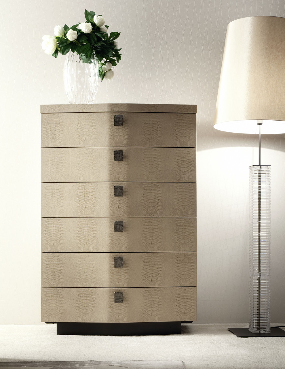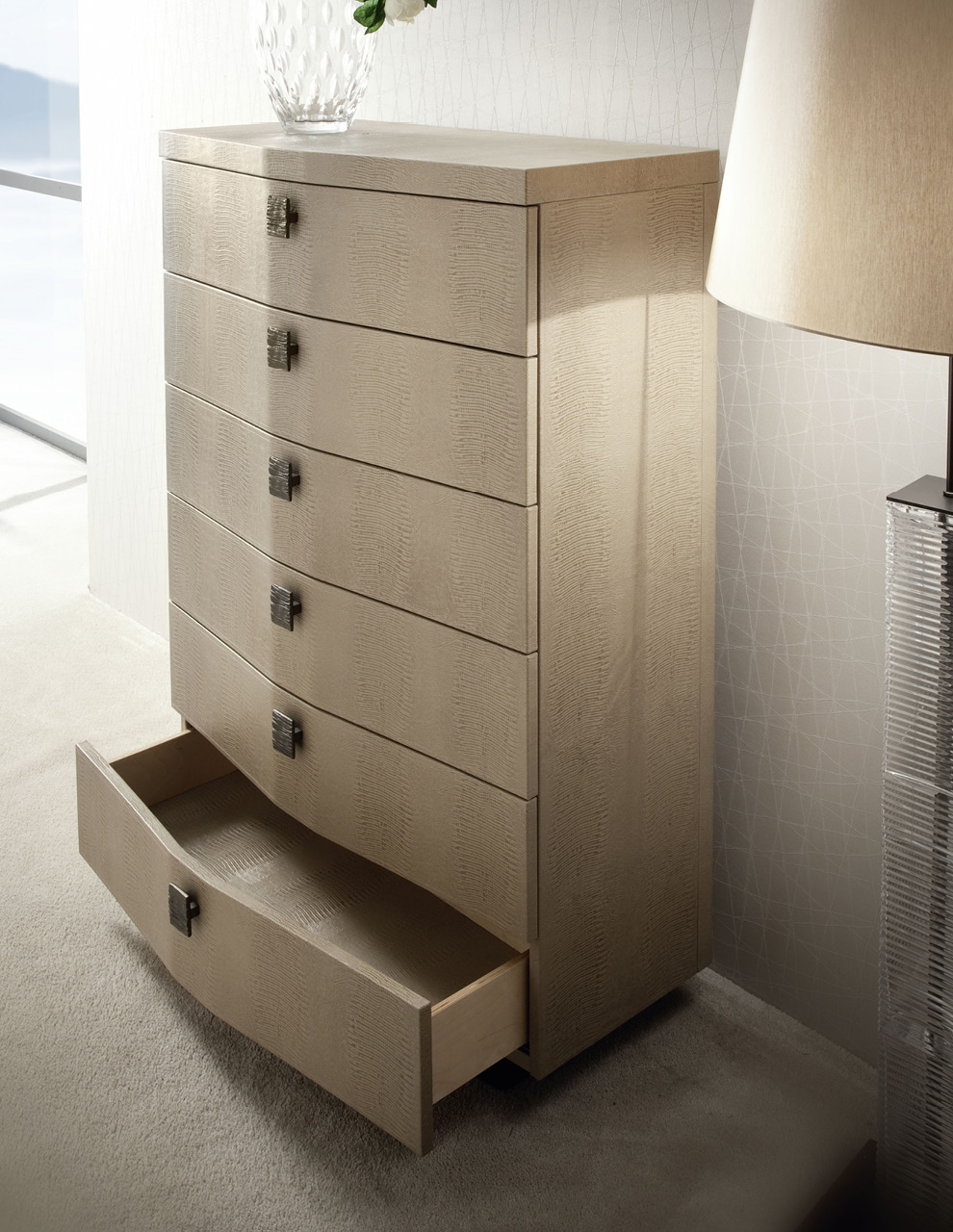 Chest in armadillo printed leather. 6 full extension drawers with drawers with bottom in armadillo printed leather. Details and handles in bronzed brass.