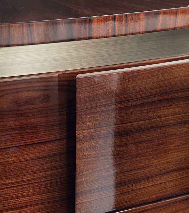 Chest with combination of brazilian rosewood veneer with high gloss polyester finish and bronzed stainless steel details. 5 full extension double drawers with bottom in velvet fabric. Bronzed stainless steel base.
