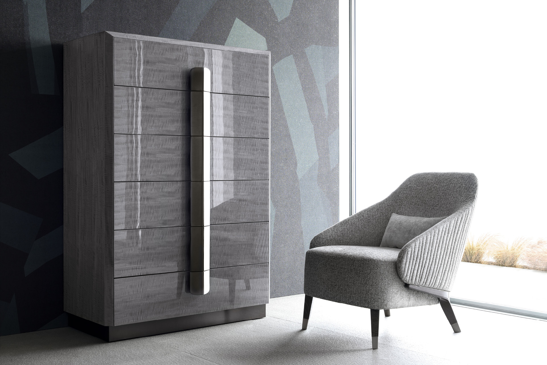 Chest in Madagascar figured Mowinghi veneer in high gloss polyester finish. Base and handles in satin black nickel stainless steel. 6 full extension drawers with bottom part in velvet fabric.