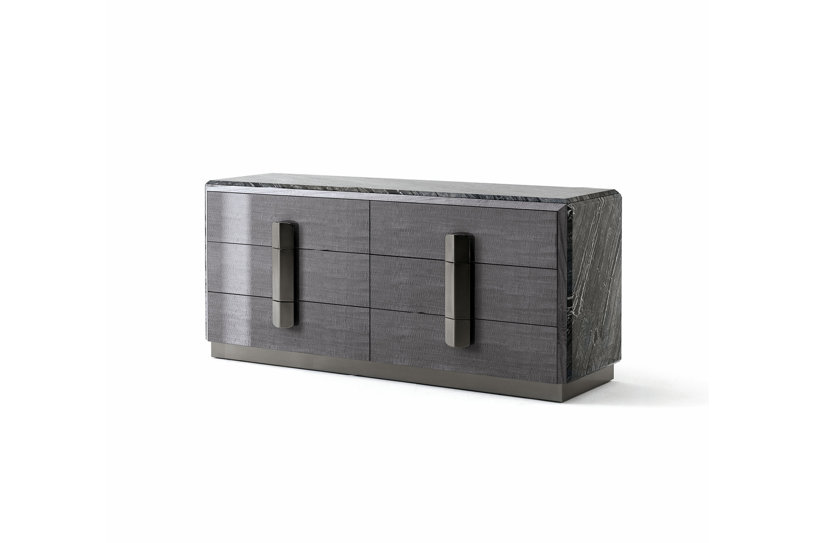 Dresser in Madagascar figured Mowinghi veneer in high gloss polyester finish. Top and sides in Kenya Black marble. Base and handles in satin black nickel stainless steel. 6 full extension drawers with bottom part in velvet fabric.