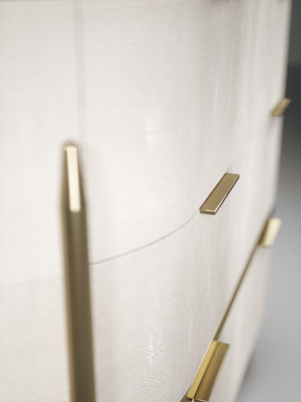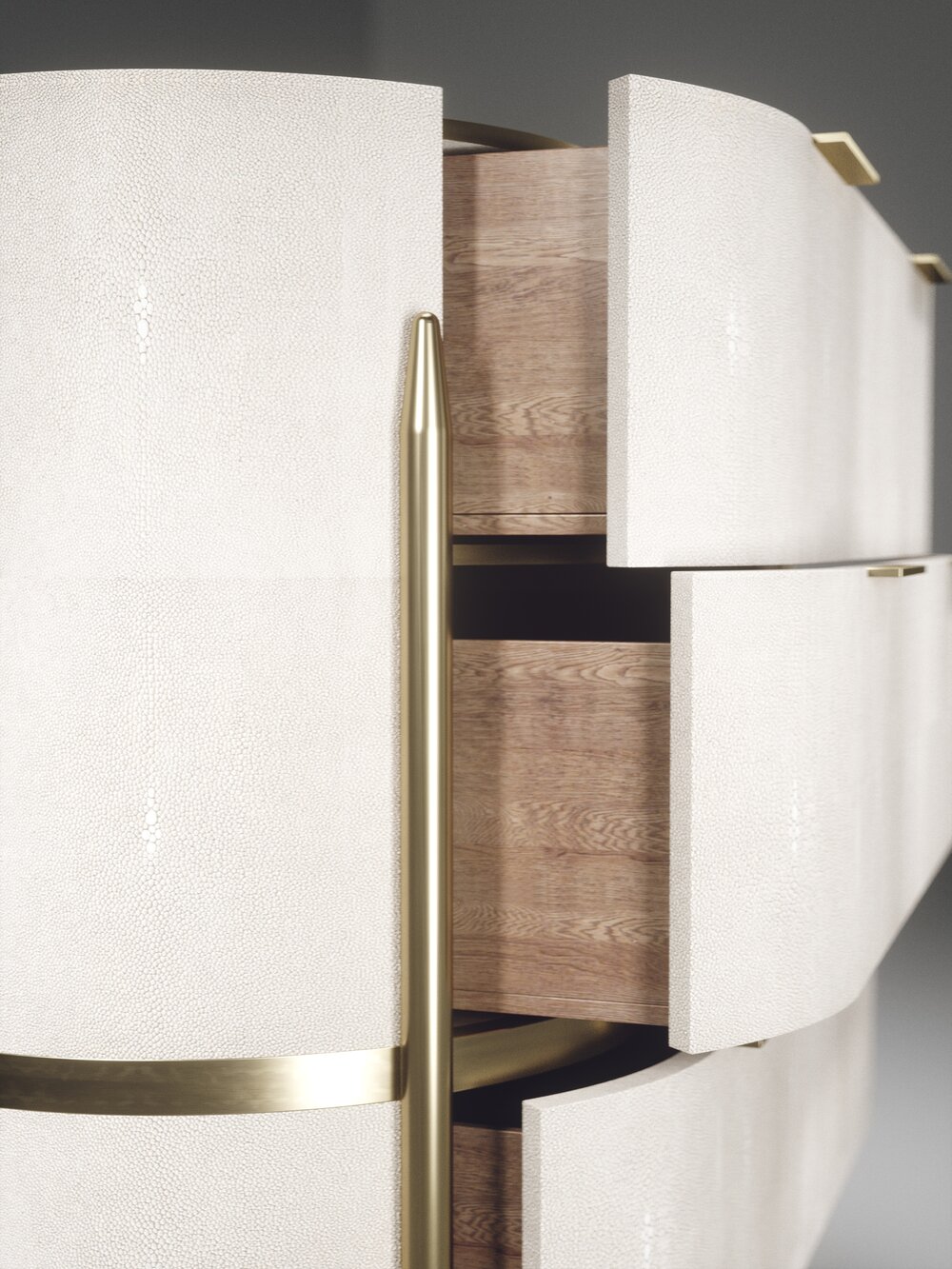 The Dandy oval chest of drawers by Kifu Paris is an elegant and a luxurious home accent, inlaid in cream shagreen with bronze-patina brass details. This piece includes 3 drawers total and the interiors are inlaid in gemelina wood veneer. Available in light grey shagreen and parchment and as a rectangle version and as a bedside table. This piece is designed by Kifu Augousti, the daughter of Ria and Yiouri Augousti.