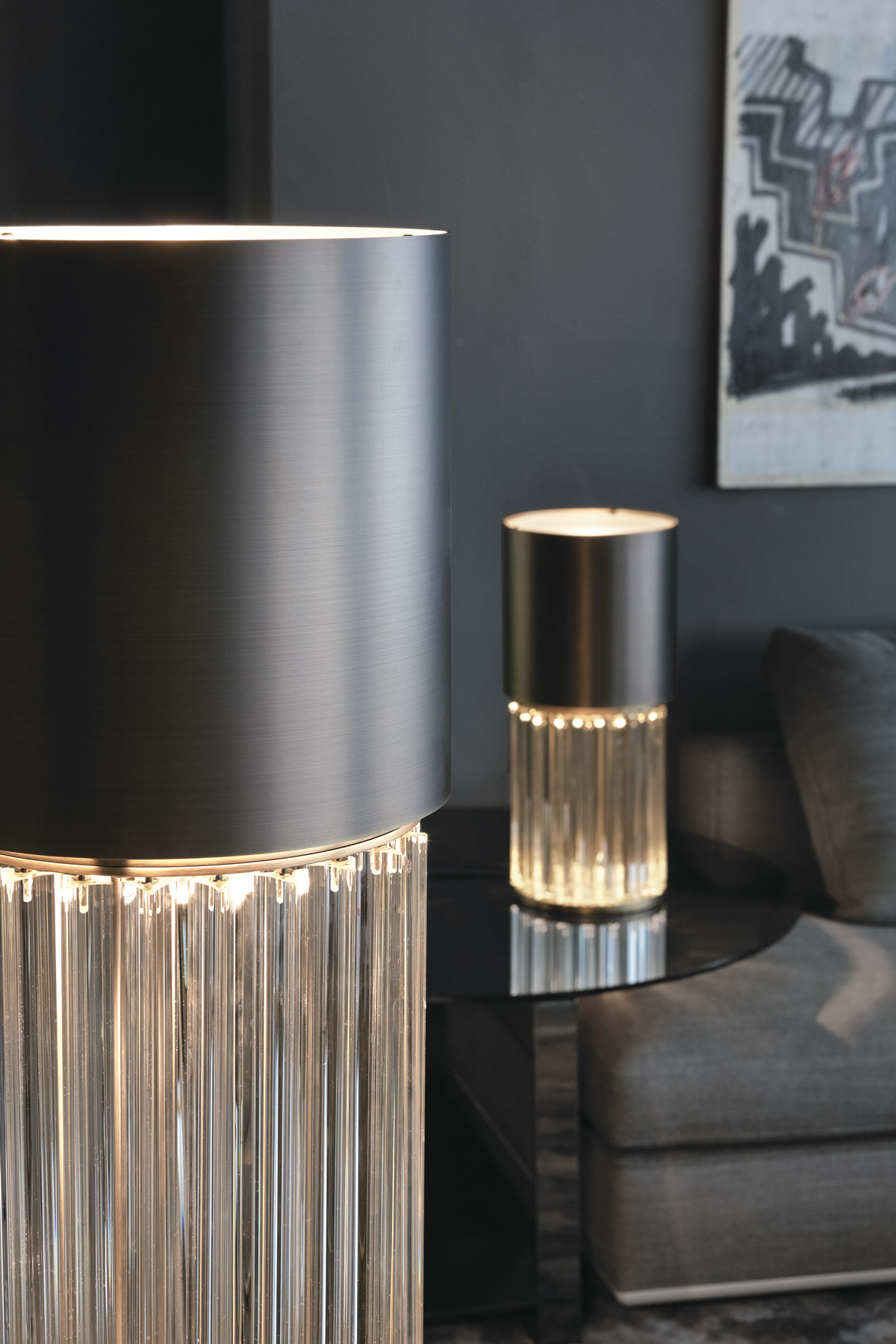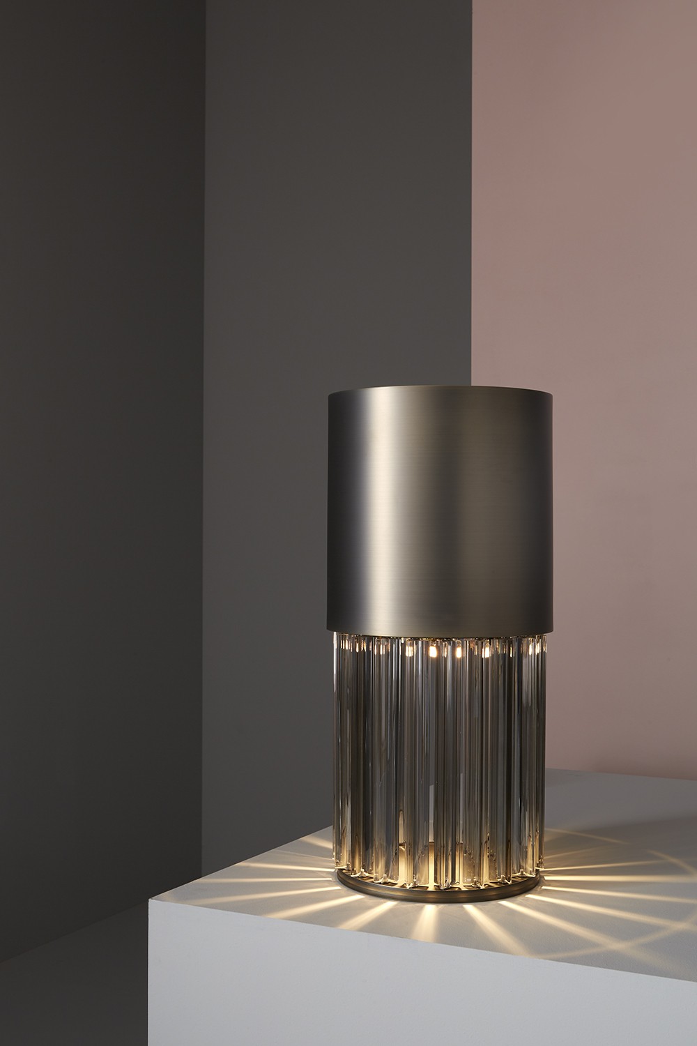 Table lamp with diffused light. Dark bronze striped structure and crystal, amber or smoke grey Murano blown glass trihedrons.