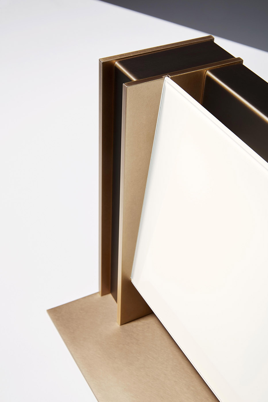 Table lamp with diffused light. Structure in pewter finish and delabré brass or burnished natural brass and dark burnished brass finish. White glass diffuser.