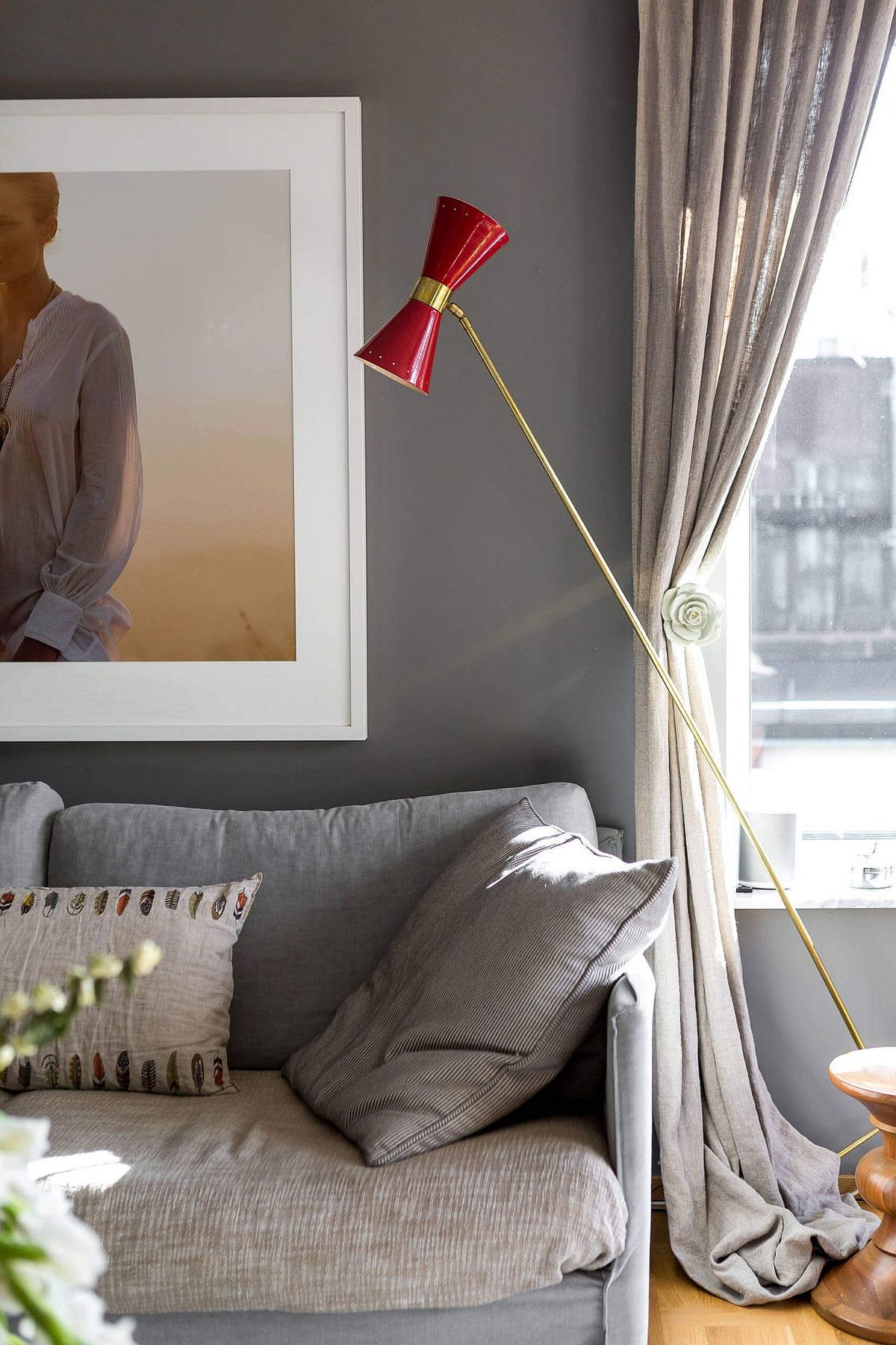 臥室里懸掛的巨幅畫作,或金或紅的落地臺(tái)燈,灰色的毛絨沙發(fā)等等極具標(biāo)志性的室內(nèi)物件,讓房間顯得無比精致而又極具誘惑力。寢具的大膽用色,與臥室整體的中性色調(diào)形成鮮明對(duì)比,讓你在這個(gè)灰色空間中,感受到無比的平靜。
