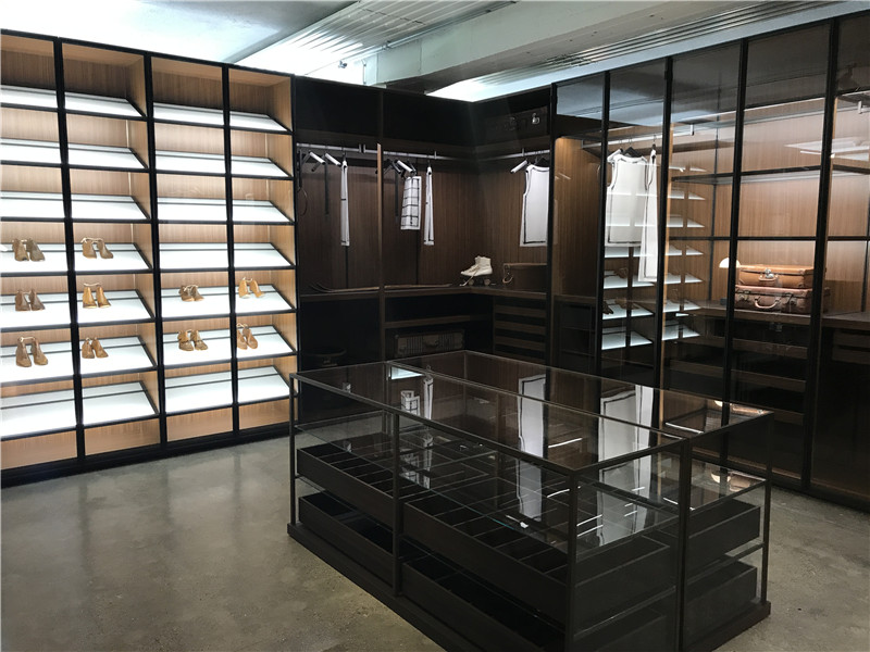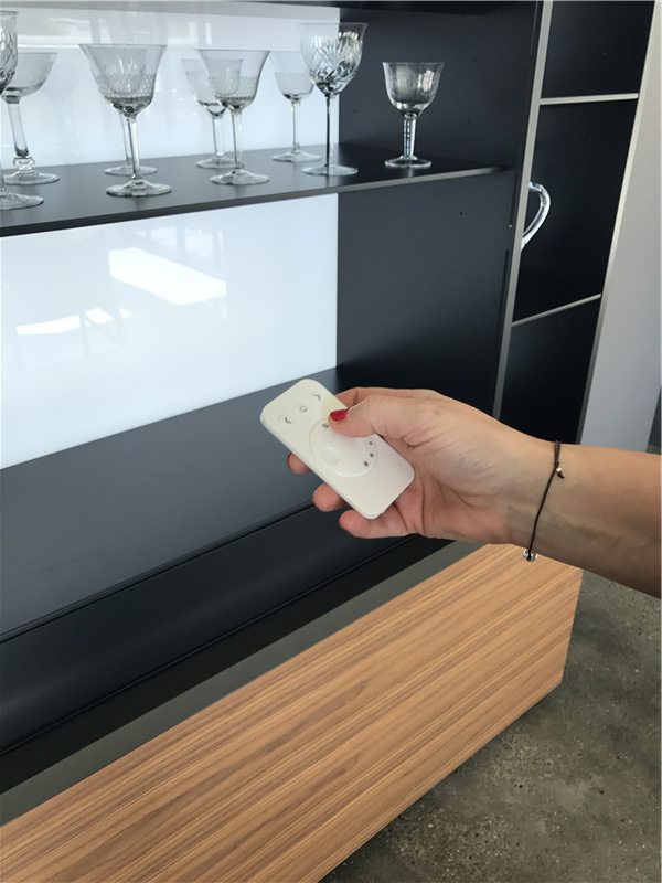 下圖的柜體,上下門可推開,這樣的設(shè)計(jì),在不占用空間的情況下,又使內(nèi)部空間大,且內(nèi)部的燈光可遙控調(diào)節(jié)。