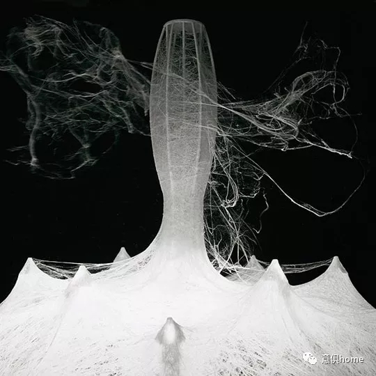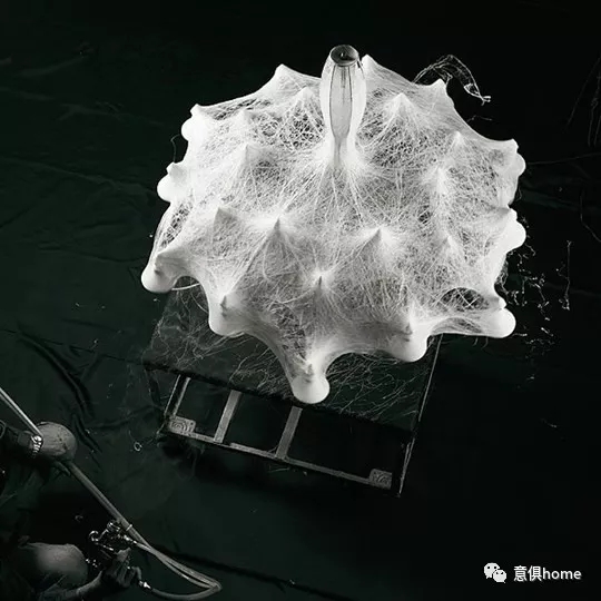 ZEPPELIN系列,外觀酷似傳統帶有金屬臂的吊燈,這是一種柔軟的玻璃樹脂產品,里面數盞小燈被包裹著,同蜘蛛織出的網一樣精巧透明,似蟬蛹、煙霧。