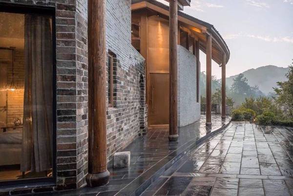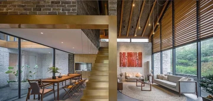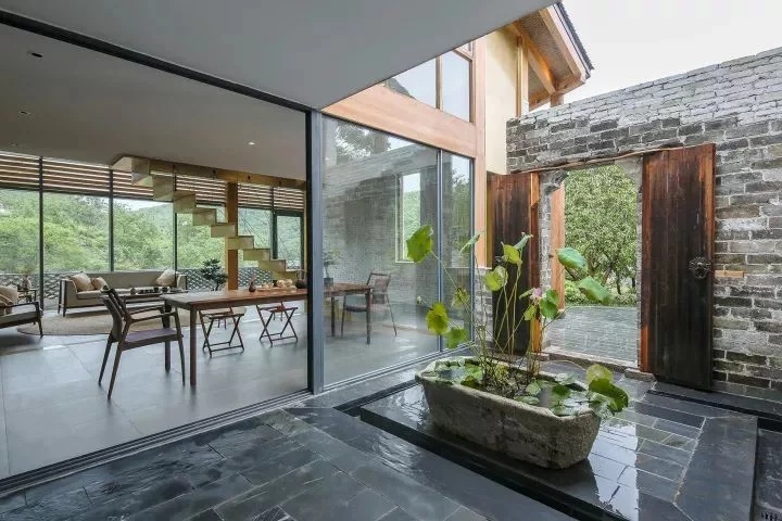 傳統(tǒng)磚瓦,木梁等材料與銅門,落地玻璃窗門的設(shè)計形成鮮明對比,現(xiàn)代工藝與傳統(tǒng)剪紙之間的融合貫通。