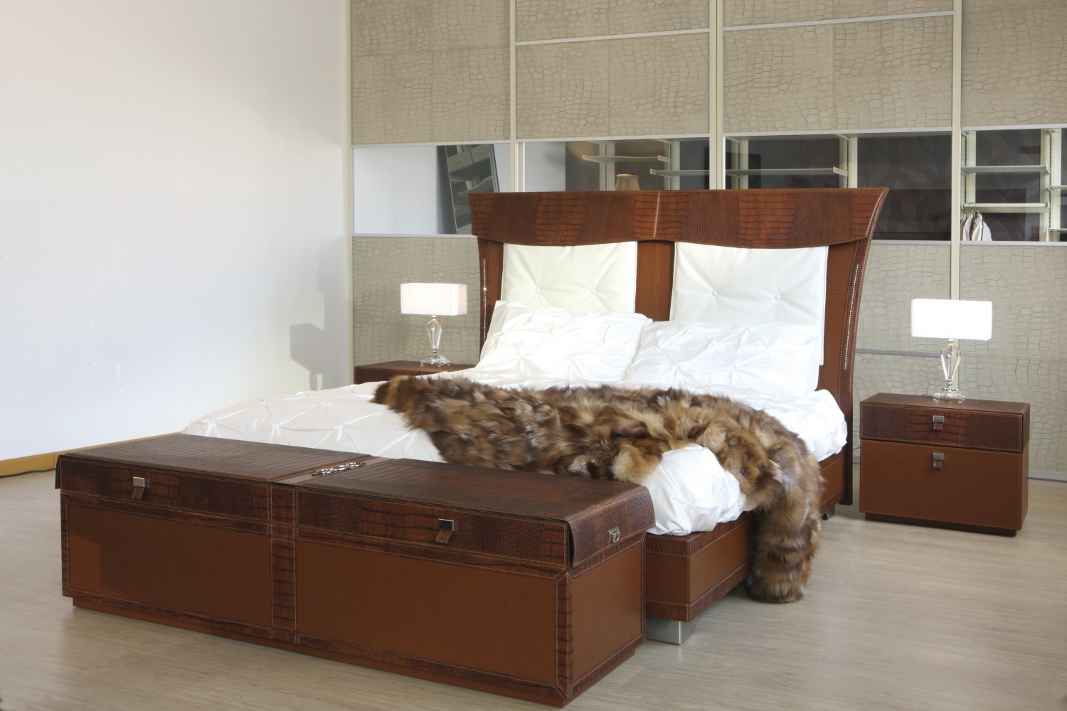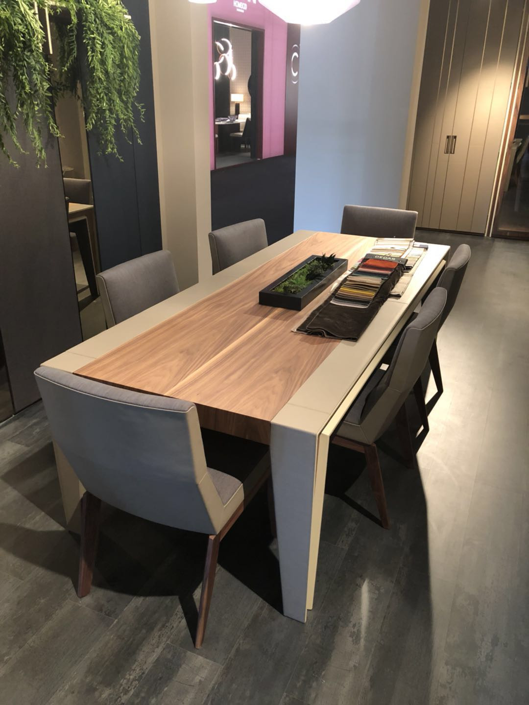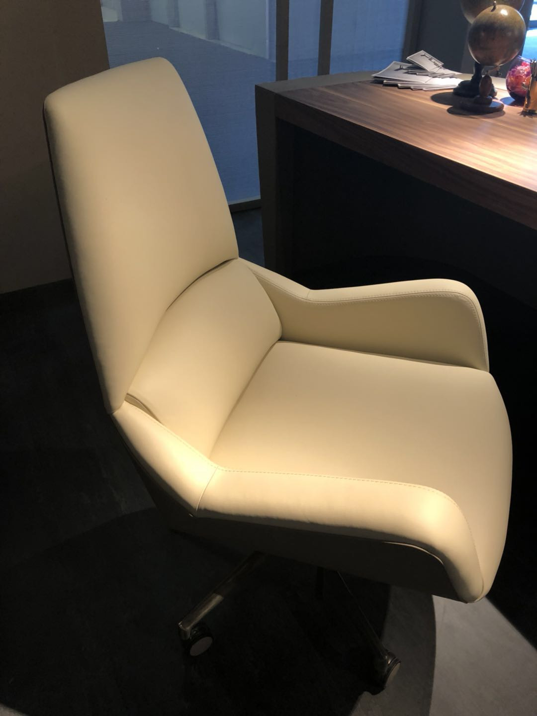 皮革與木料之間不同品種的紋理碰撞,光滑亮麗的皮革搭配富有紋理的木材,搭配白色的皮質椅子,優雅盡顯。