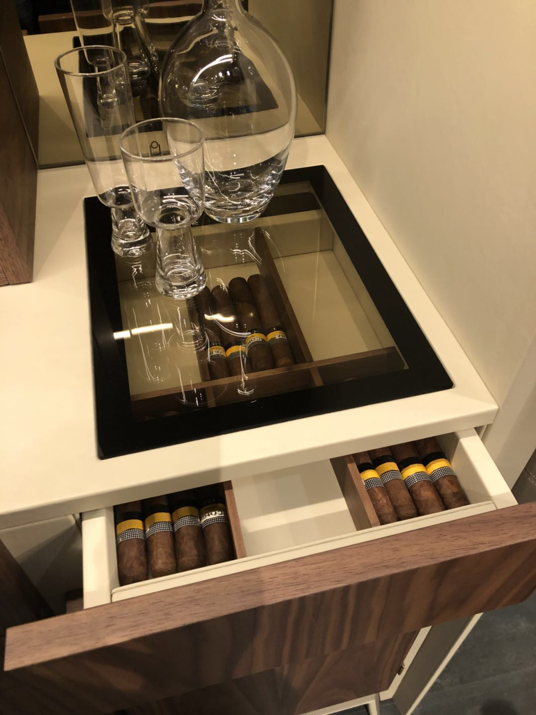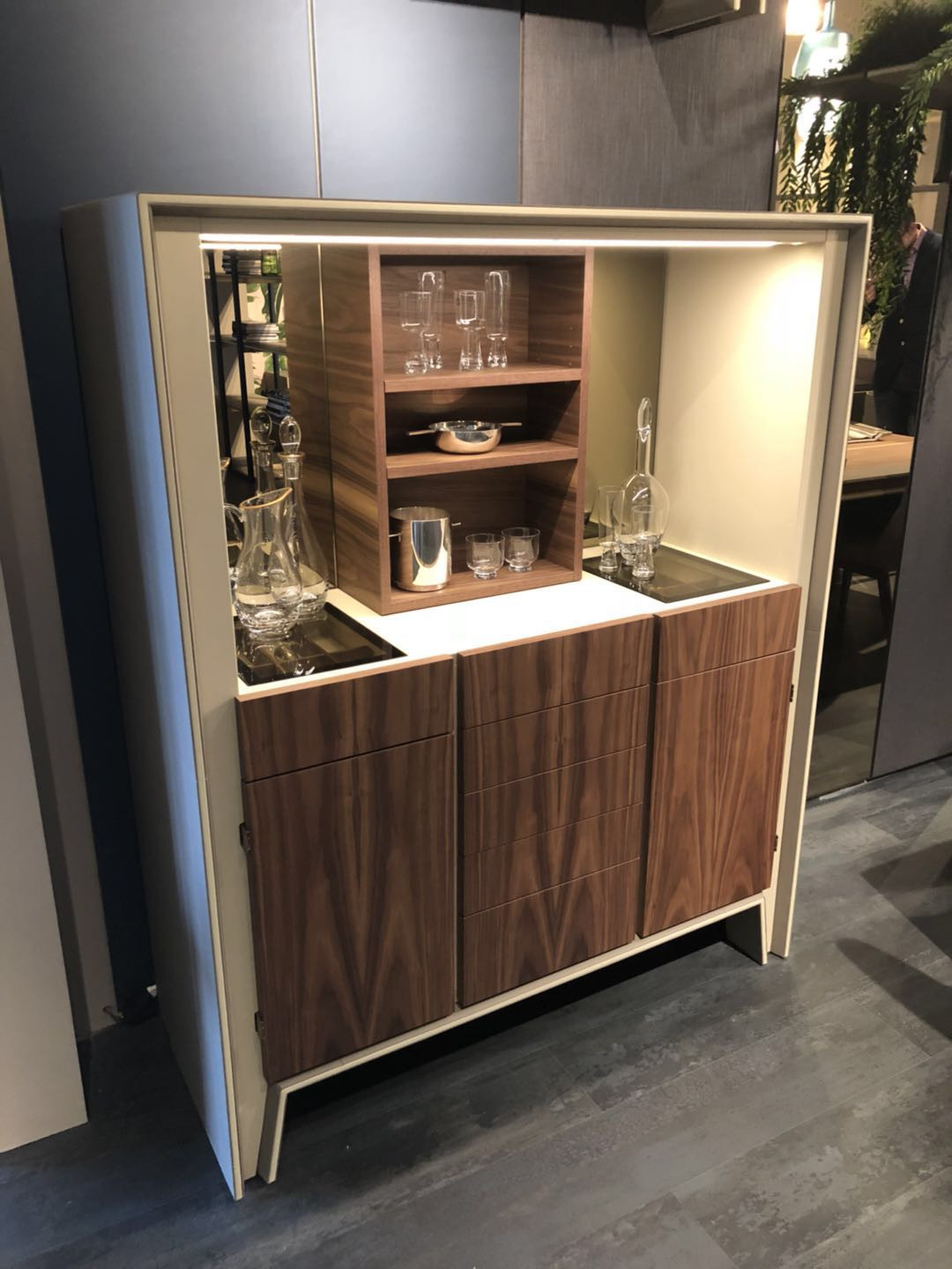 弧形的柜門打開后,內部是雙層擺放空間,可擺放各種酒杯等。整個柜體里里外外都用奶白色皮革所包裹,搭配金屬外扣裝飾,使設計簡單的同時又不落俗套。