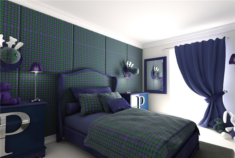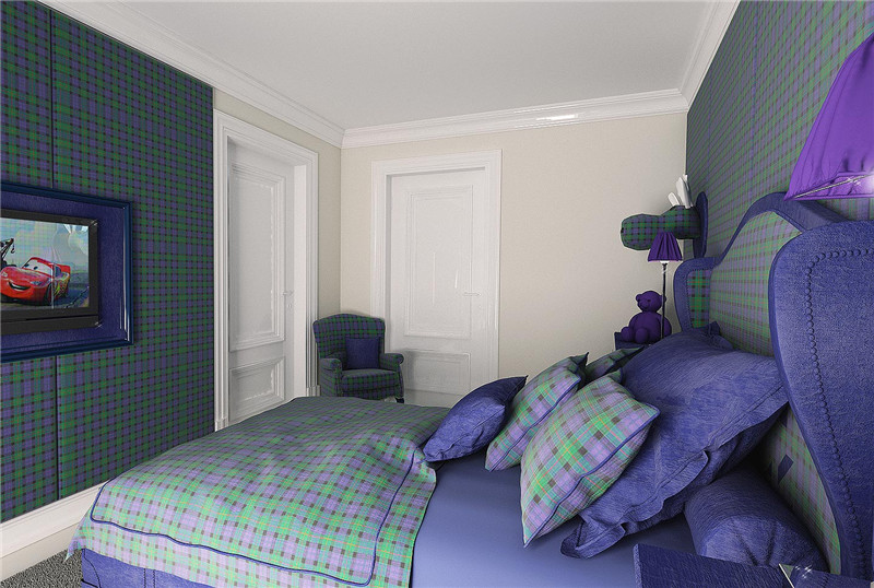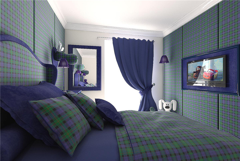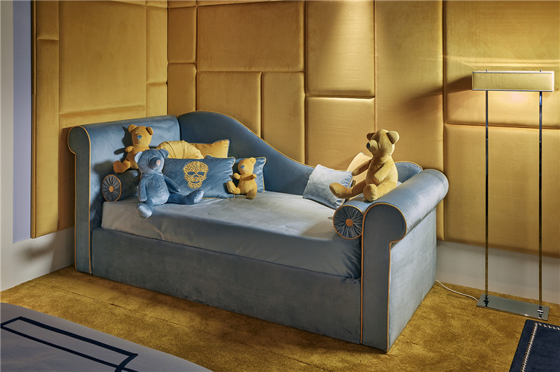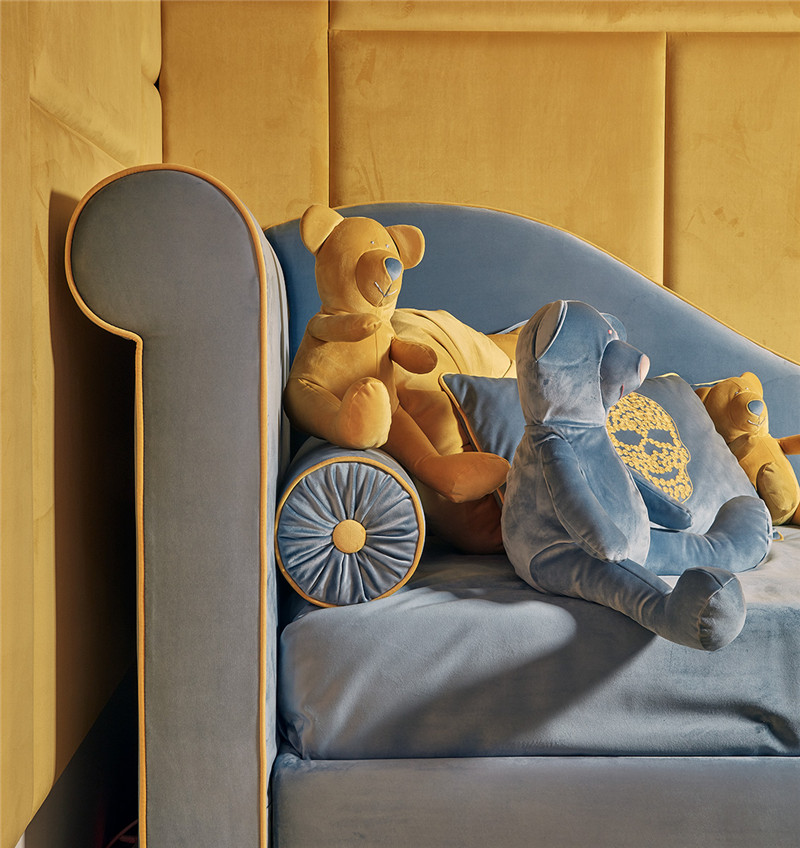 這是一款小熊格子風格的男孩子系列臥室,床體用藍色天鵝絨包裹,柔軟的面料充滿安全感,而靠墊用了藍色格子的布料,相比上一款的干凈簡單,這款更適合年紀稍微小一些的孩子。