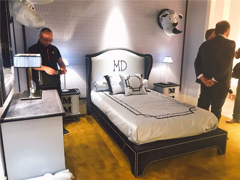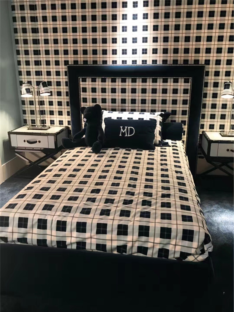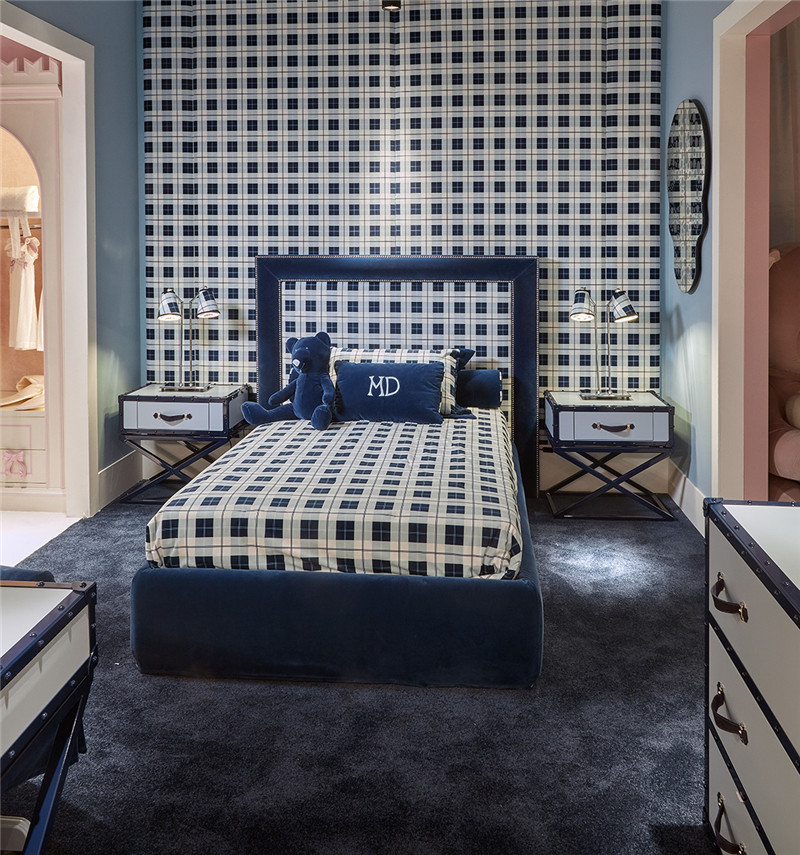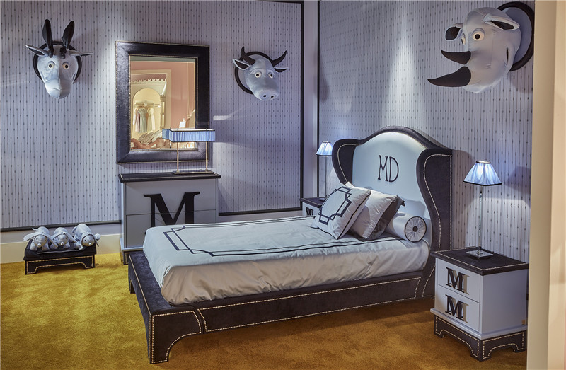 這是一款男孩子風格的臥室系列,黑白配色干凈簡單的同時,金絲線描邊使空間少了點單調,多了可愛,就連DOLFI兒童系列的標志(MD),都用頑皮的字體秀在了床頭。