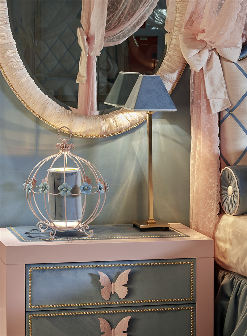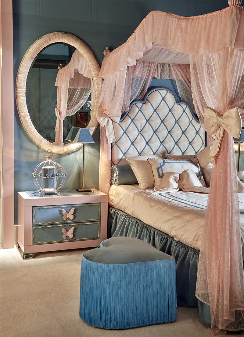 花型的床背用天藍色的絲綢包裹,金絲描邊,打造夢幻的同時也要奢華,蕾絲紗簾加上大大的蝴蝶結,心形坐墊和蝴蝶??康拇差^柜,是每個女孩子心目中的理想臥室。