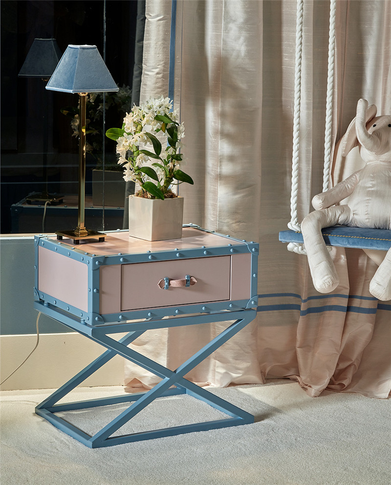 床頭柜則設計成了皮箱樣式,柜腳是折疊凳形狀式,充滿設計感,又符合孩子所特有的可愛俏皮。