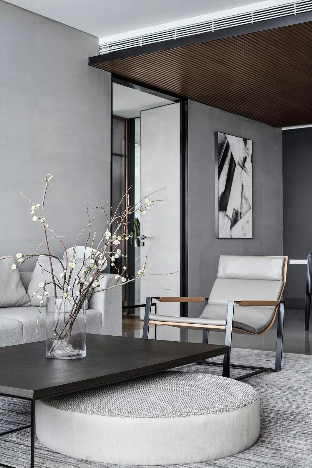客廳現(xiàn)代沙發(fā)配合禪意枯枝,剛柔并濟,兩側墻邊均暗藏玻璃移門,由此可進入主臥以及書房。
