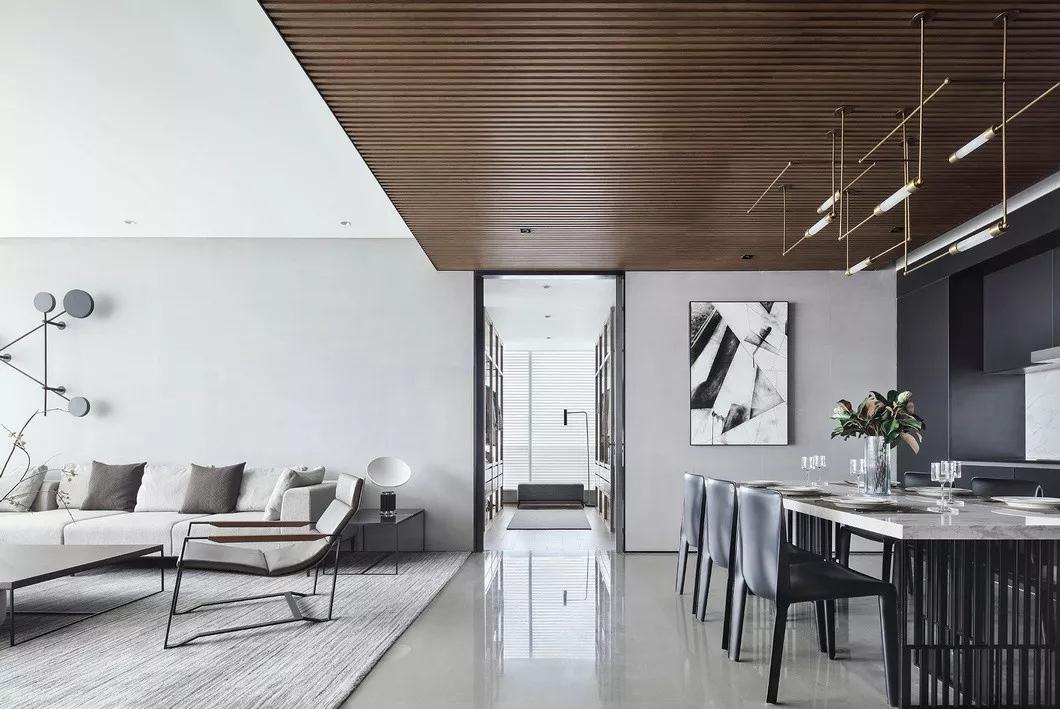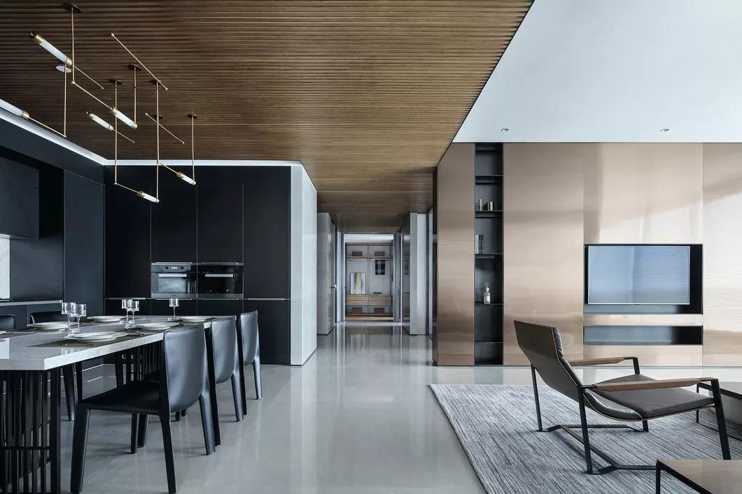 以客餐廳為中心,中軸動線串聯(lián)各功能區(qū)域,主次關系配合得當。頂面胡桃木格柵與大理石的銜接收邊、以及墻面金屬勾縫,則印證對設計細節(jié)的出色把控。
