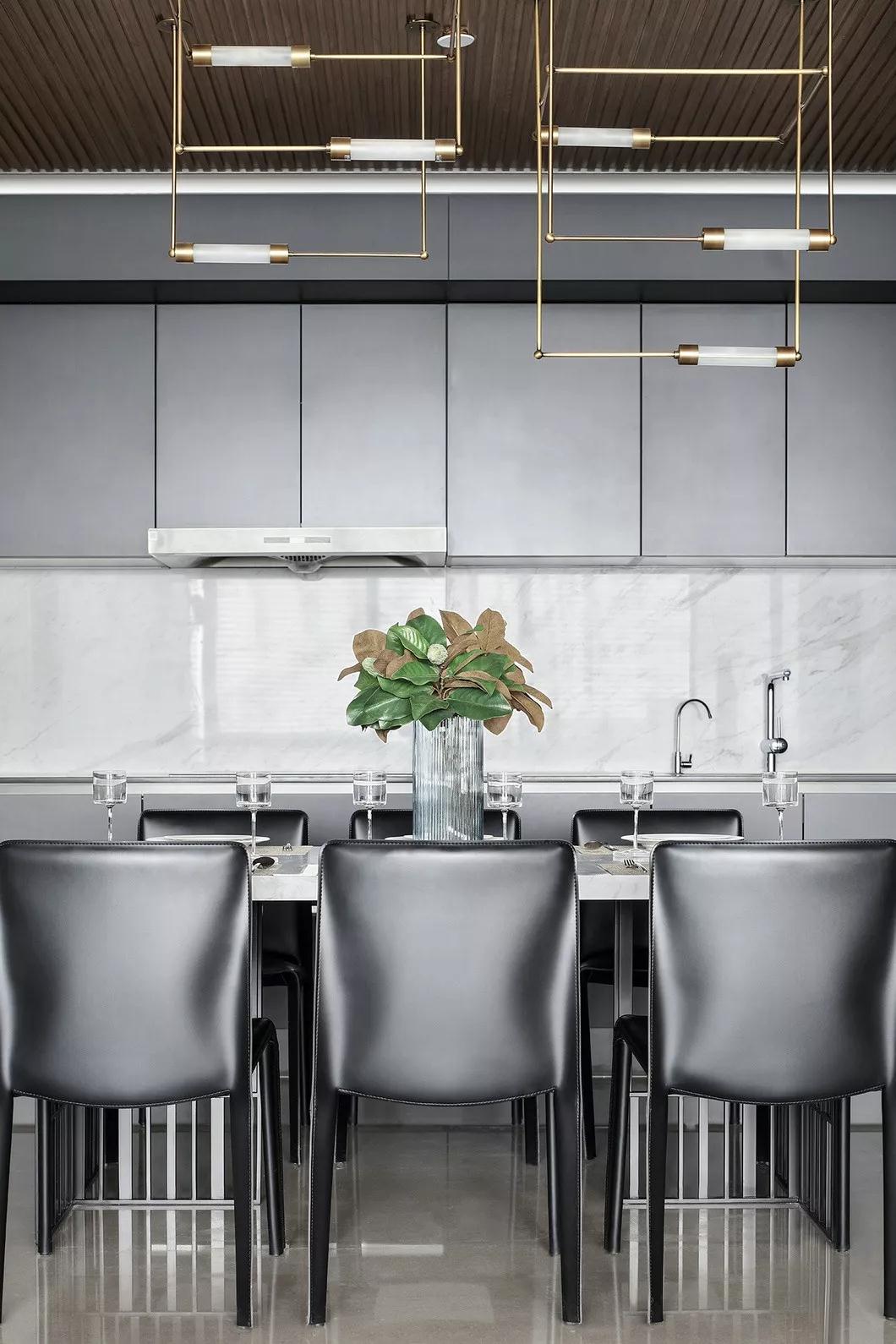 餐廳運用錯落有致的吊燈,黑白灰元素非規(guī)則堆積的畫作,軟化空間方正感,勾勒出視覺宣泄點。