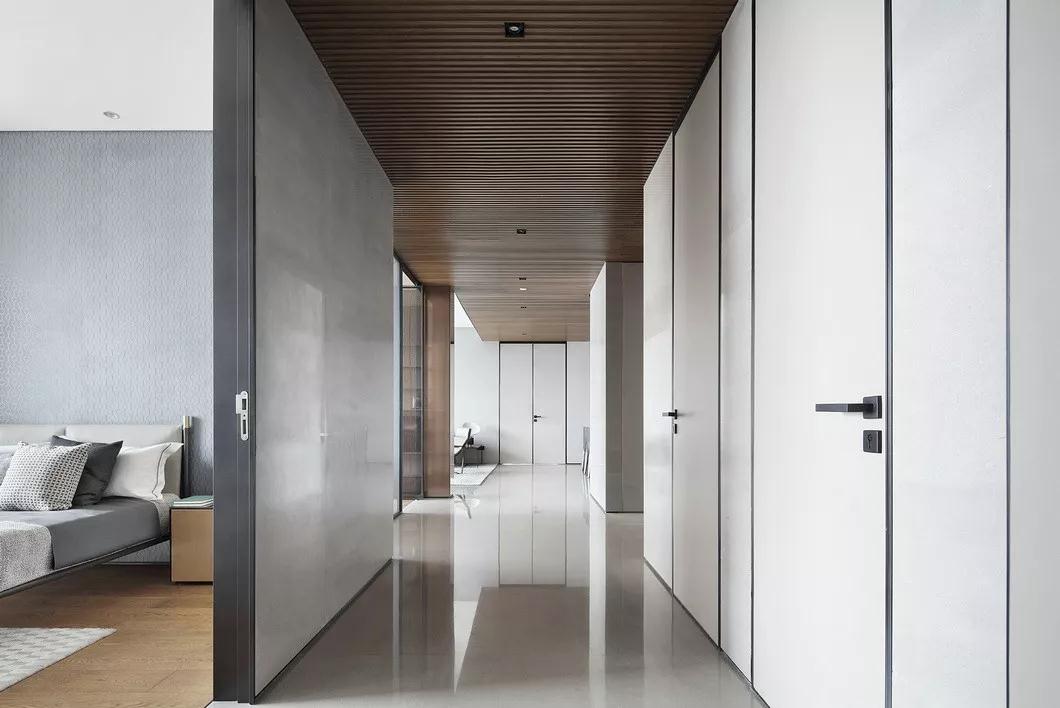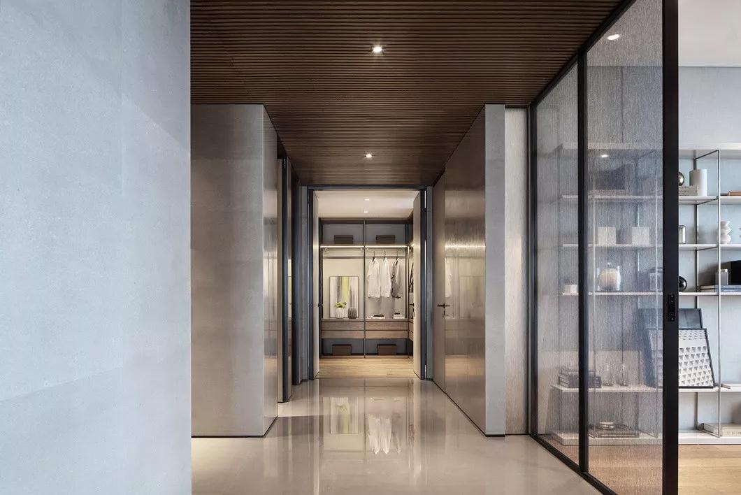 步入式衣帽間與主臥以回形動線相連,增強了空間的流動性。肌理顯著,硬朗之余,木質讓空間變得溫和。此外又與次臥套間的衣帽間在兩端遙相呼應。