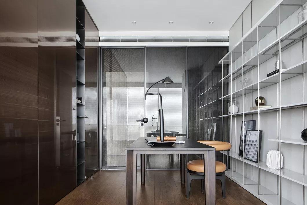 書房位于電視背景墻后,選用開放式書架,用金屬元素呼應整體力量感。落地窗引入光源,基于夾絲玻璃若隱若現(xiàn)的特質,讓書房與外部空間關系上既模糊又交織。