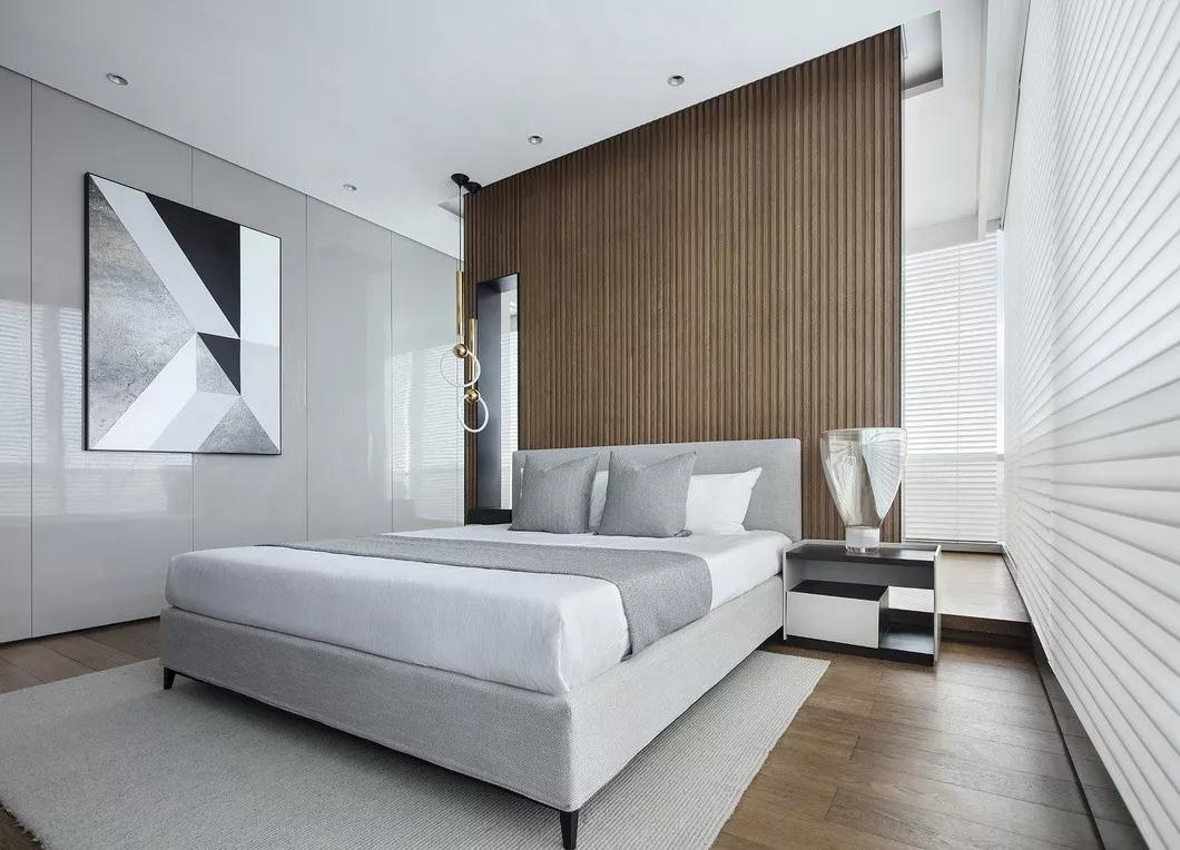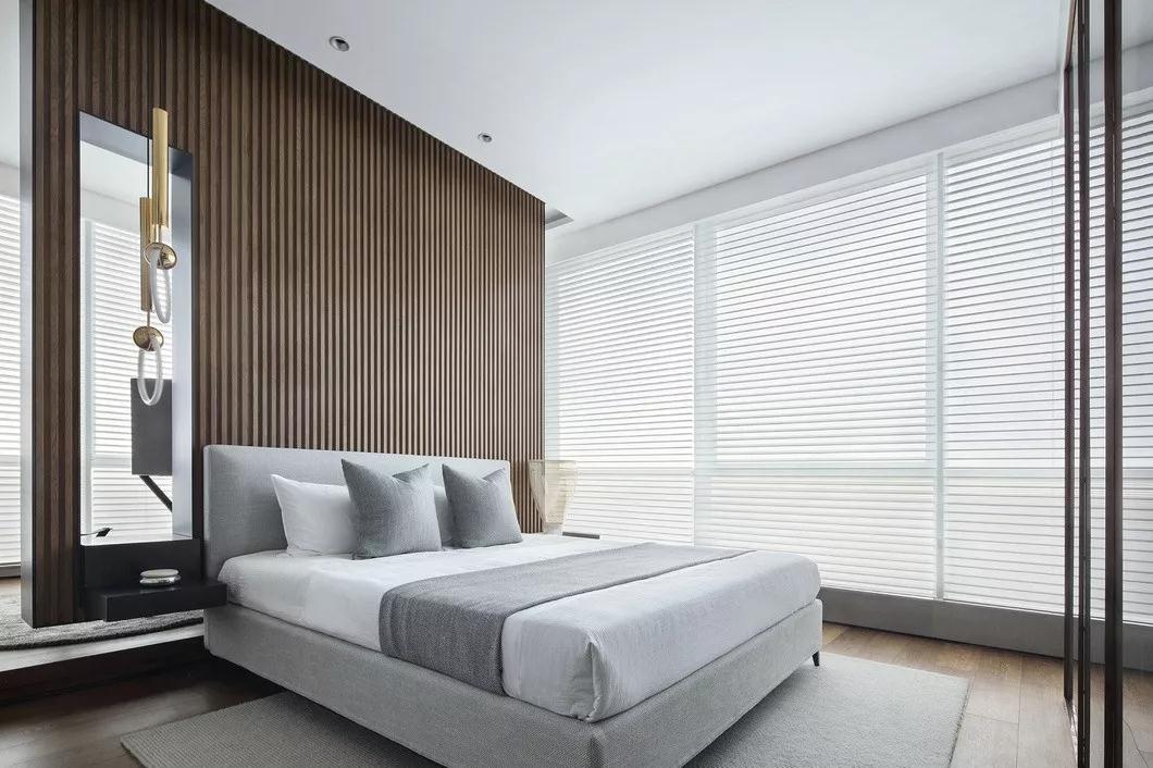 主臥擁有充裕的采光,格柵窗簾與胡桃木元素縱橫間強化虛實韻律。垂落的吊燈,淡然的床品、幾何形塊的畫作,氤氳出融合意境。