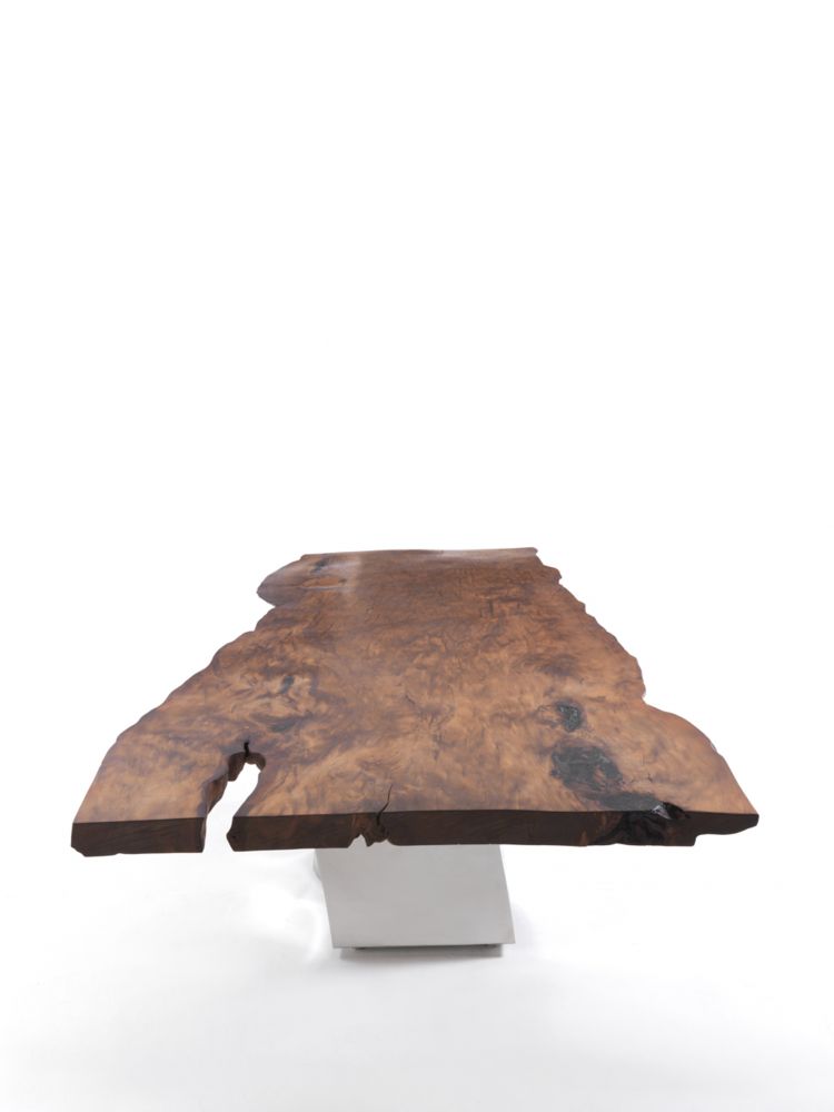 餐桌桌面由新西蘭古老的木材——貝殼杉木制成,國際著名的藝術(shù)家赫利登·希沙克在設計這款餐桌時,將鍛造的鋼片作為餐桌的底柱,這是自然產(chǎn)物與人工材料的結(jié)合。