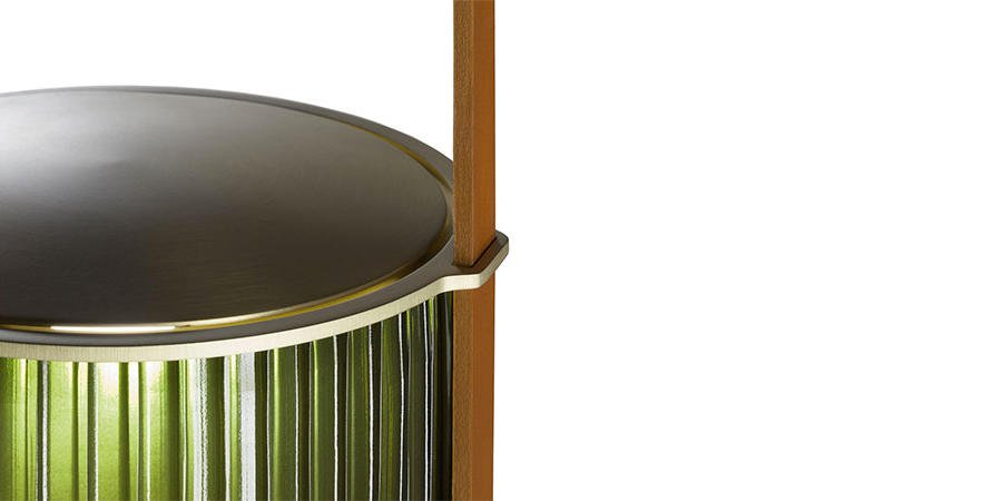 吹制的玻璃和馬鞍皮制成的燈線就像燈籠一般,使燈具的整體造型如純凈的線條和精致的材料對比,將吹制玻璃的兩種元素結合在一起,上部玻璃有一個特別均勻的表面,是透明的陰影琥珀(祖母綠、藍寶石或月亮石),下半部分由一部分珍珠制成,只為讓光線更溫暖更加發散!