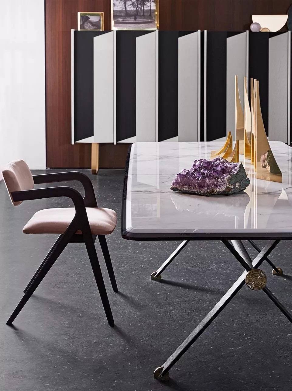 除此之外,Gallotti&Radice在不銹鋼、黃銅、鋁等多種材料與玻璃結合的設計運用中,以優雅的玻璃主體呈現家具輕盈通透的懸浮視覺,輔以金屬材質凸顯作品的精致與奢華感,同樣表現的游刃有余。