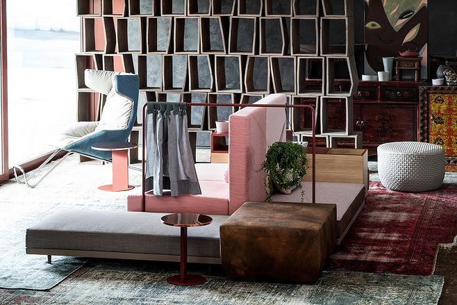 MOROSO的Bikini Island 沙發,是由多個色塊組成的多功能區沙發,深淺蜜桃色的運用,讓人想到日落時分的彩霞,有一種美好安靜的感覺。