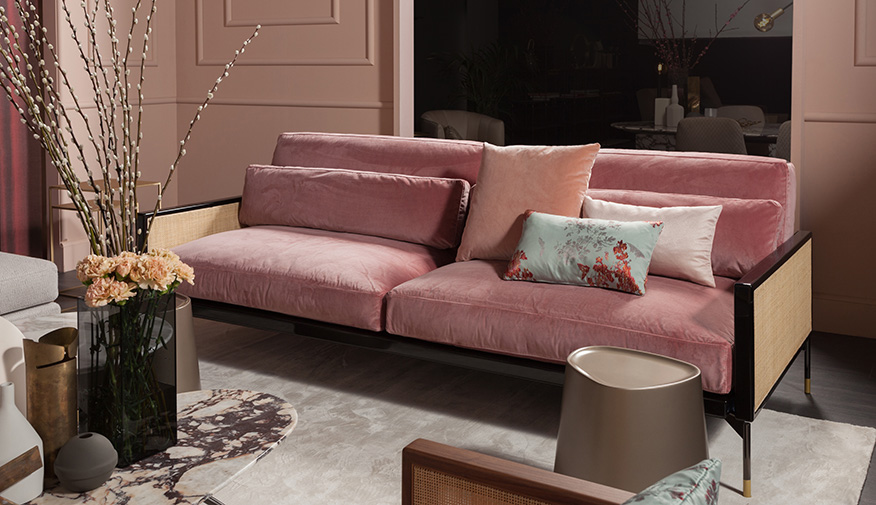 Vibieffe的115 MODERN EPOQUE沙發以蜜桃色為主色,讓空間更加有溫度。在這樣的沙發上放松自己,工作的疲憊會立刻散去,這是蜜桃色傳遞的舒適感。