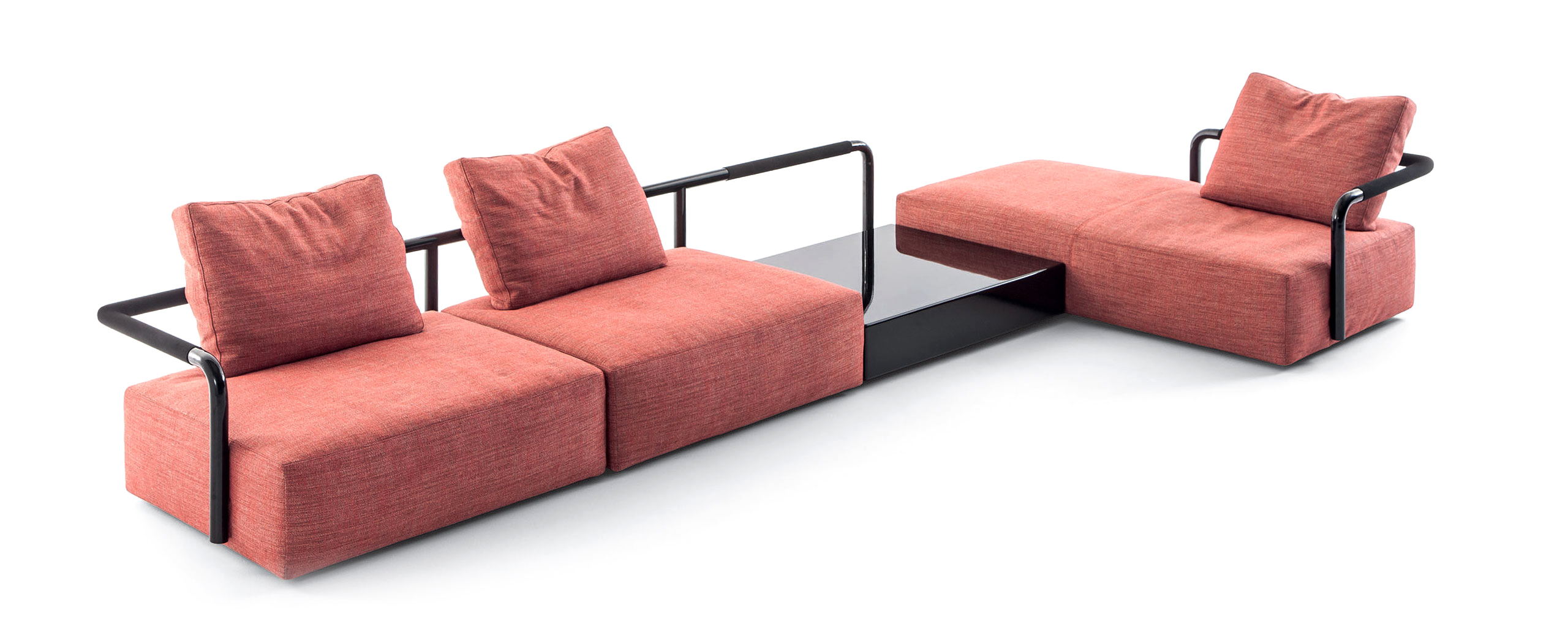 Cassina的503 SOFT PROPS沙發用黑色金屬管將柔軟鏈接起來,形成了一個保護邊界。蜜桃色軟墊配黑管的運用,讓人聯想到女性雖外表堅強但內心柔軟。